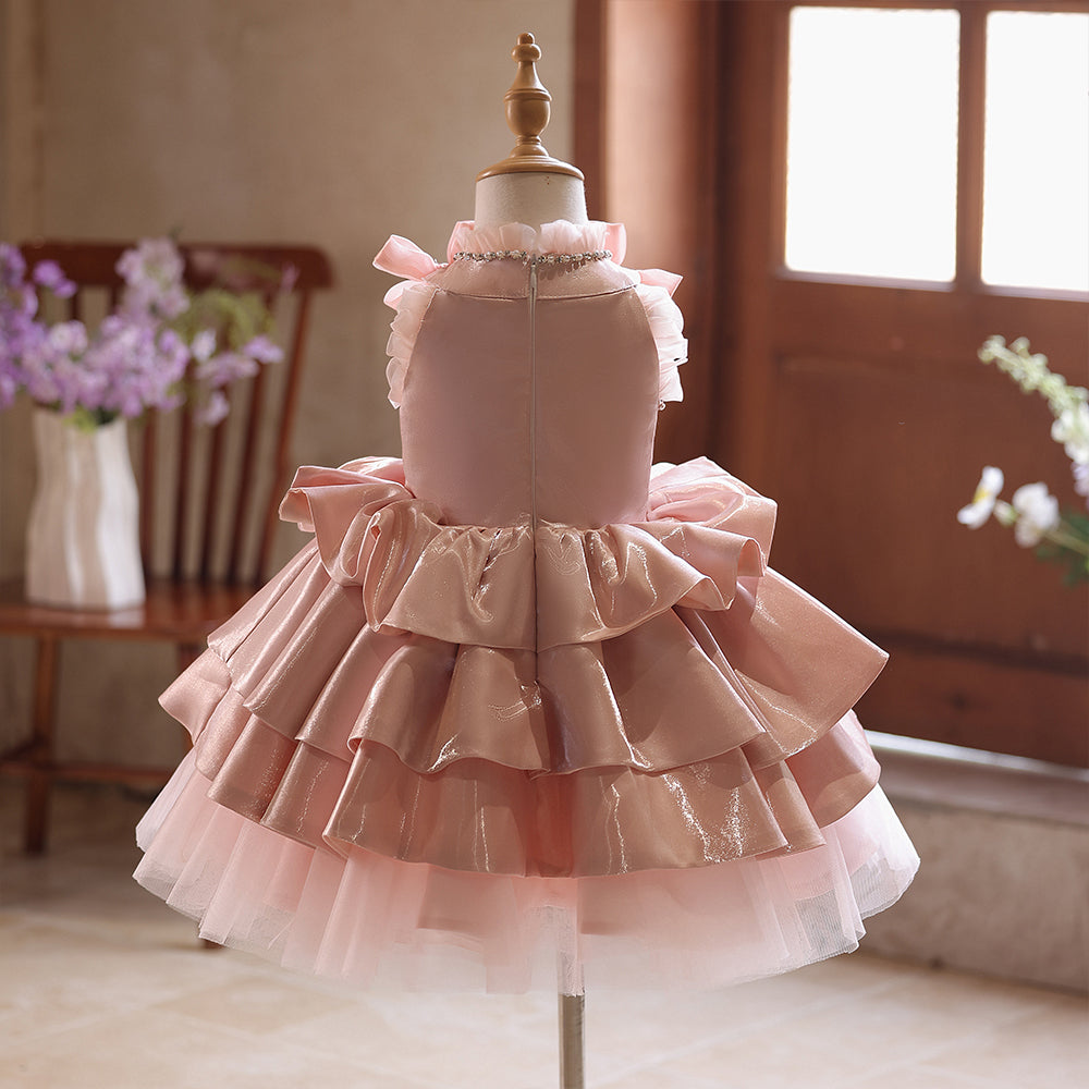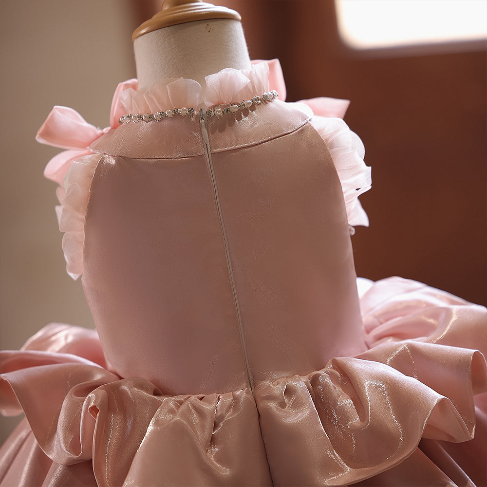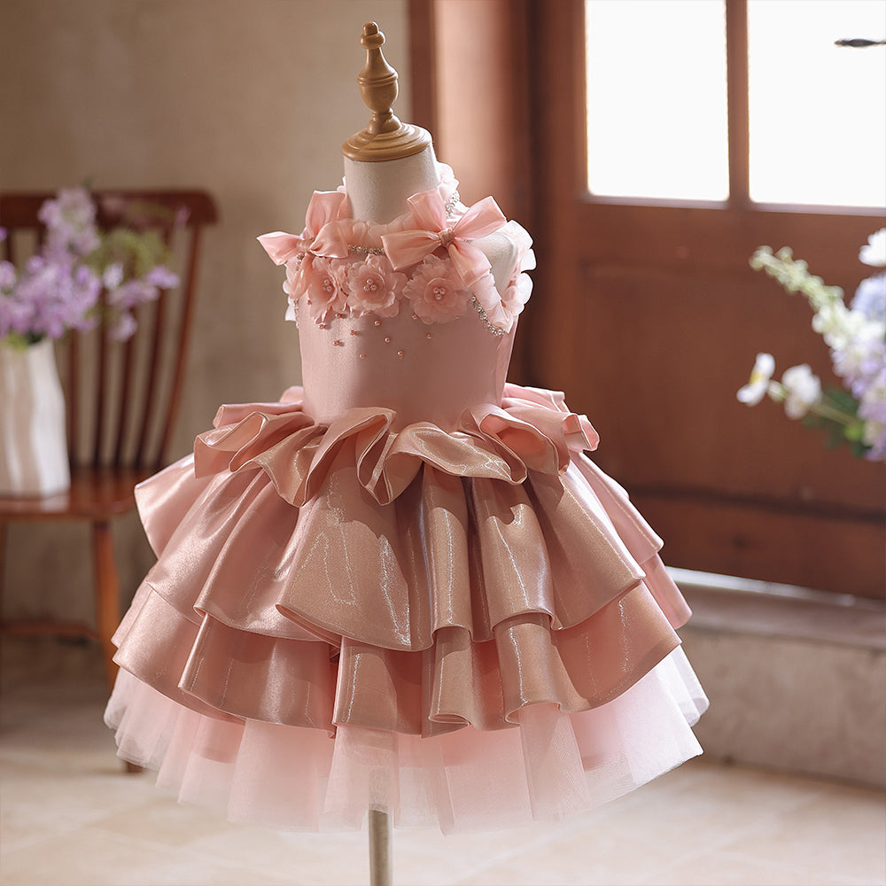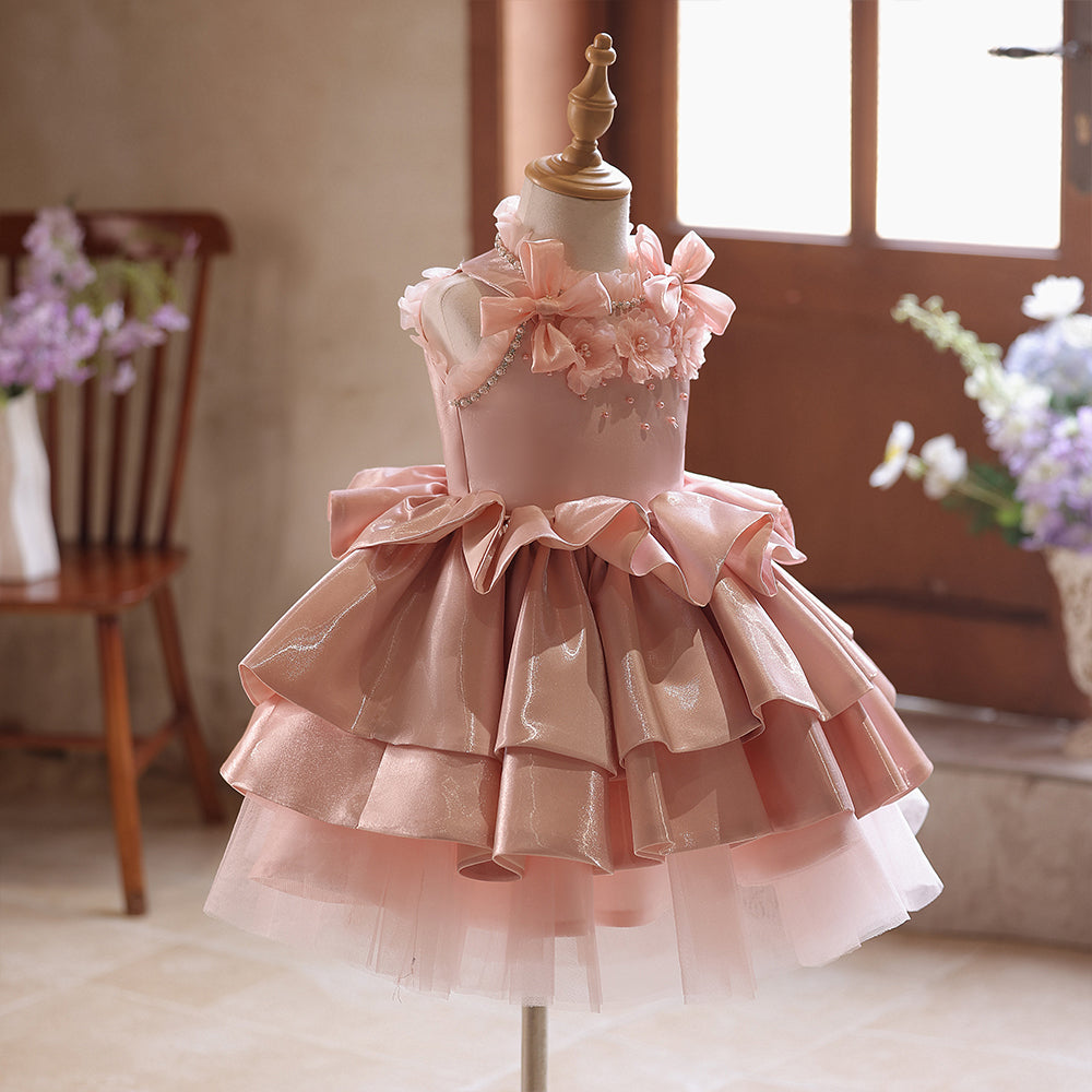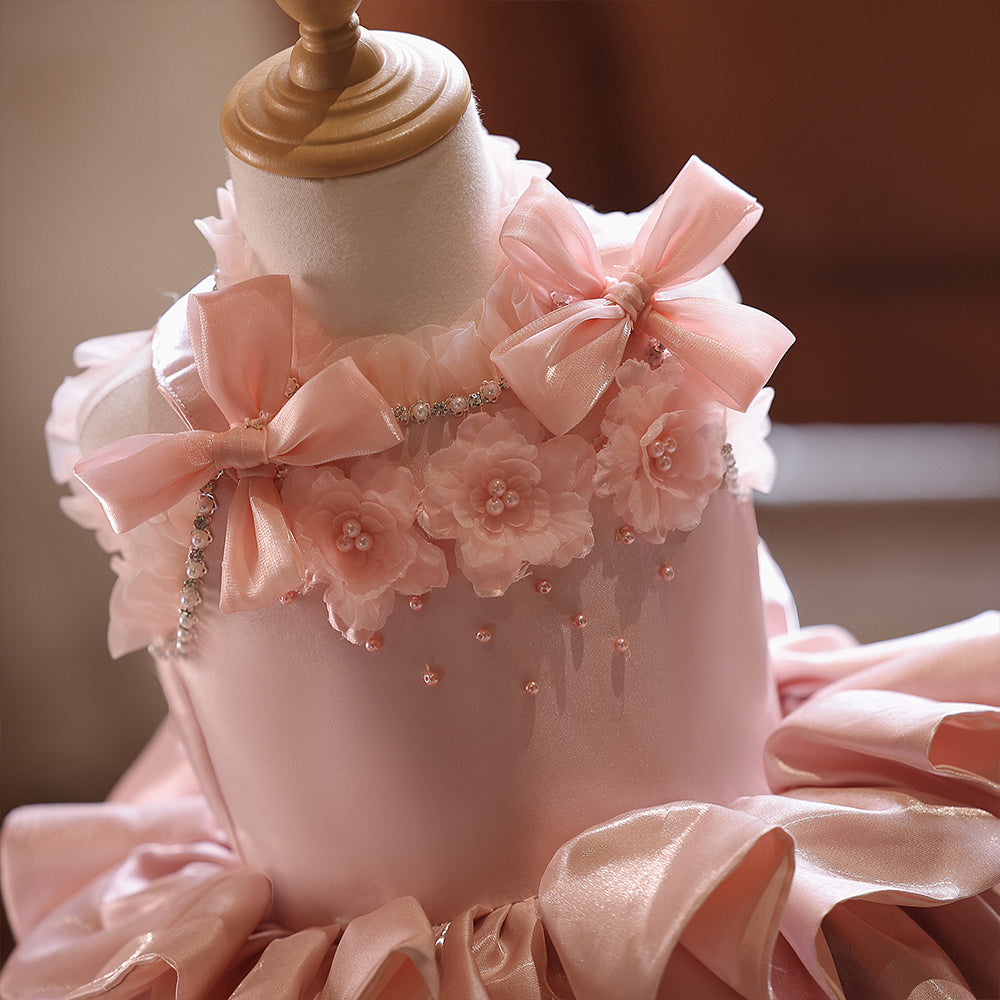 3D Flowers High Neck Pink Sequin Satin Pleated Girls Pageant Dress