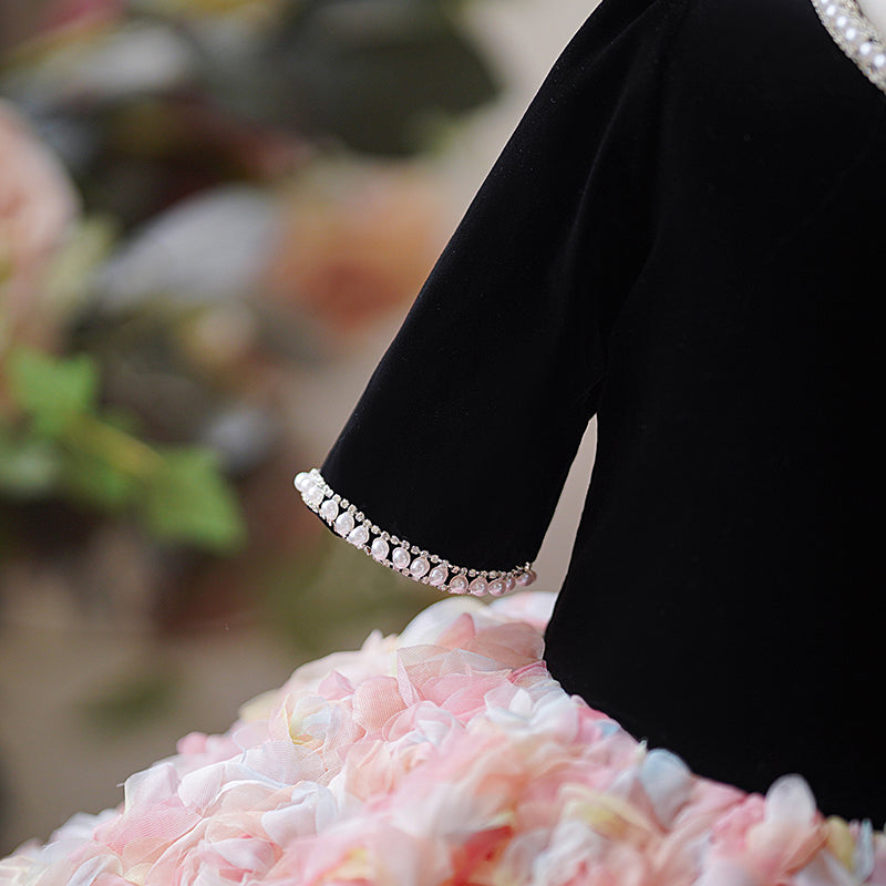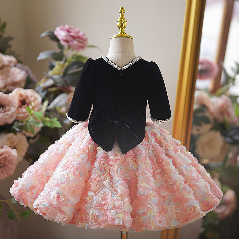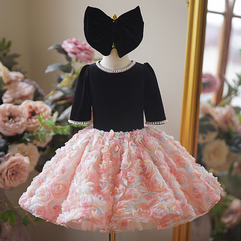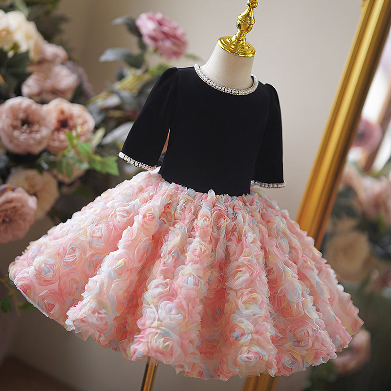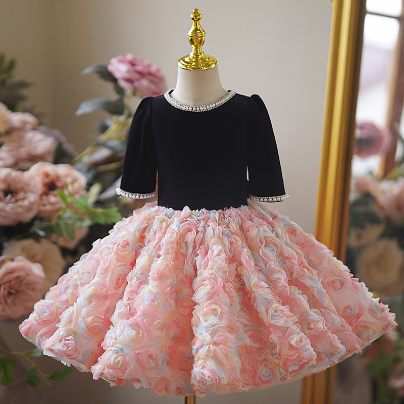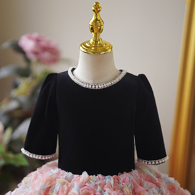 Beading Black & Pink Ruffle Girls Birthday Dress with Half Length Sleeves