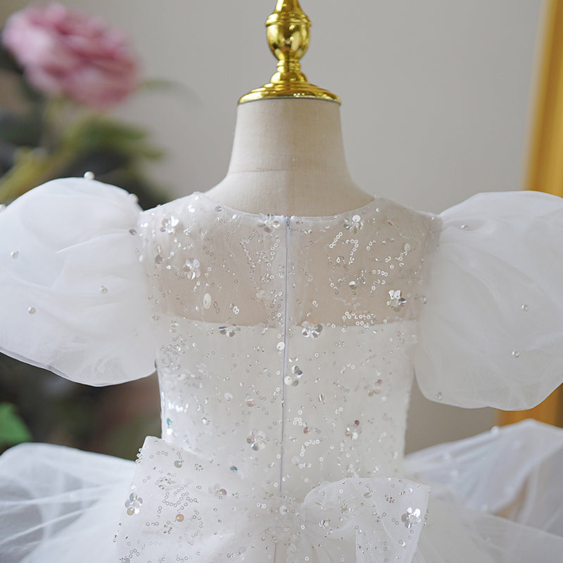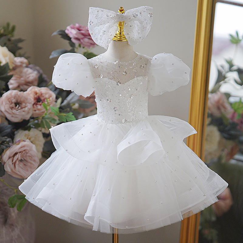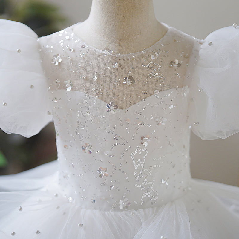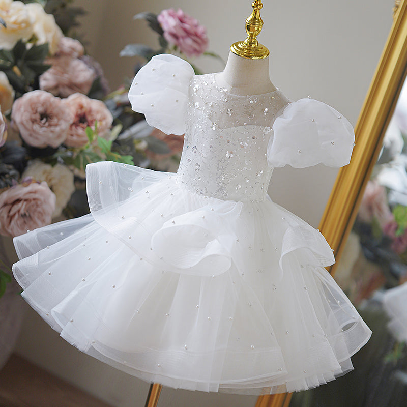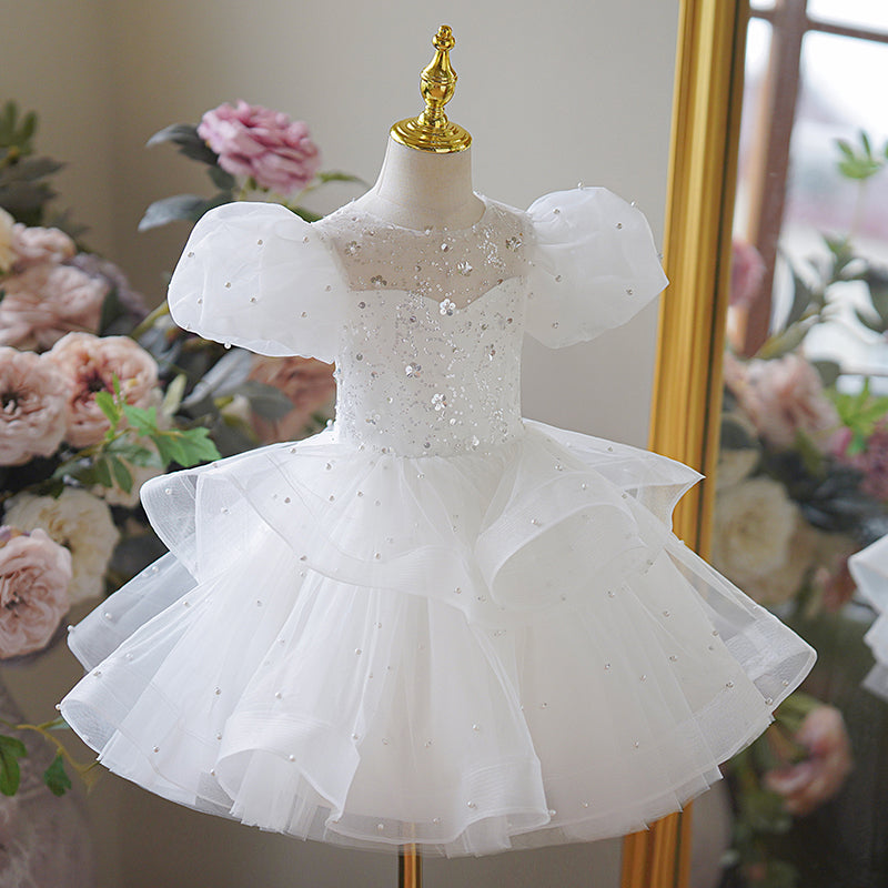 Beading Jewel Ruffle White Flower Girl Dress with Short Sleeves