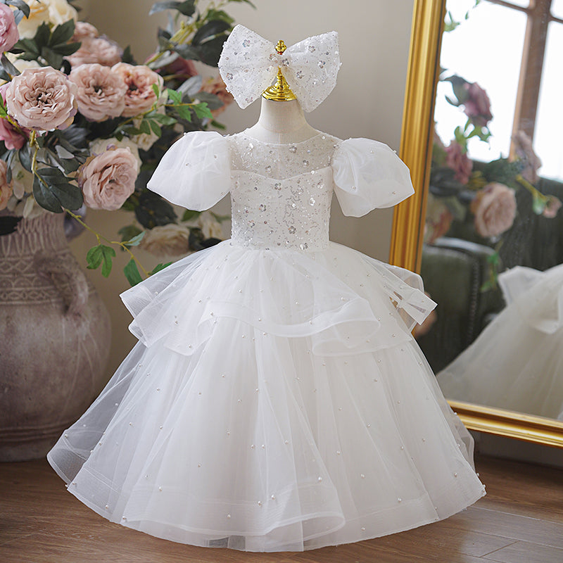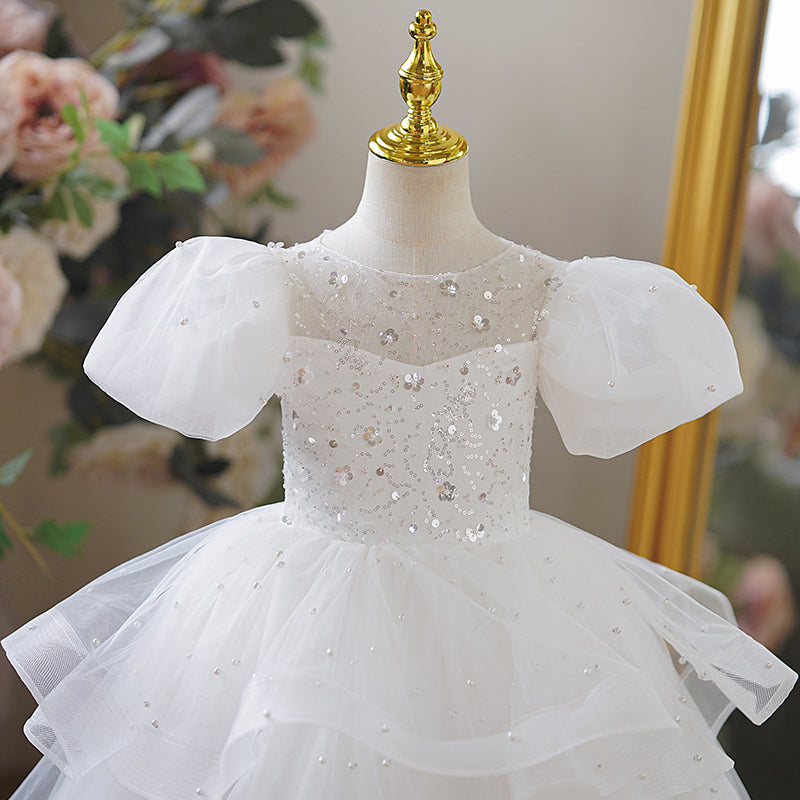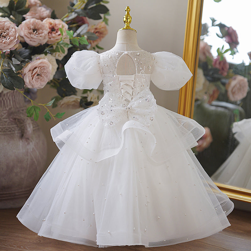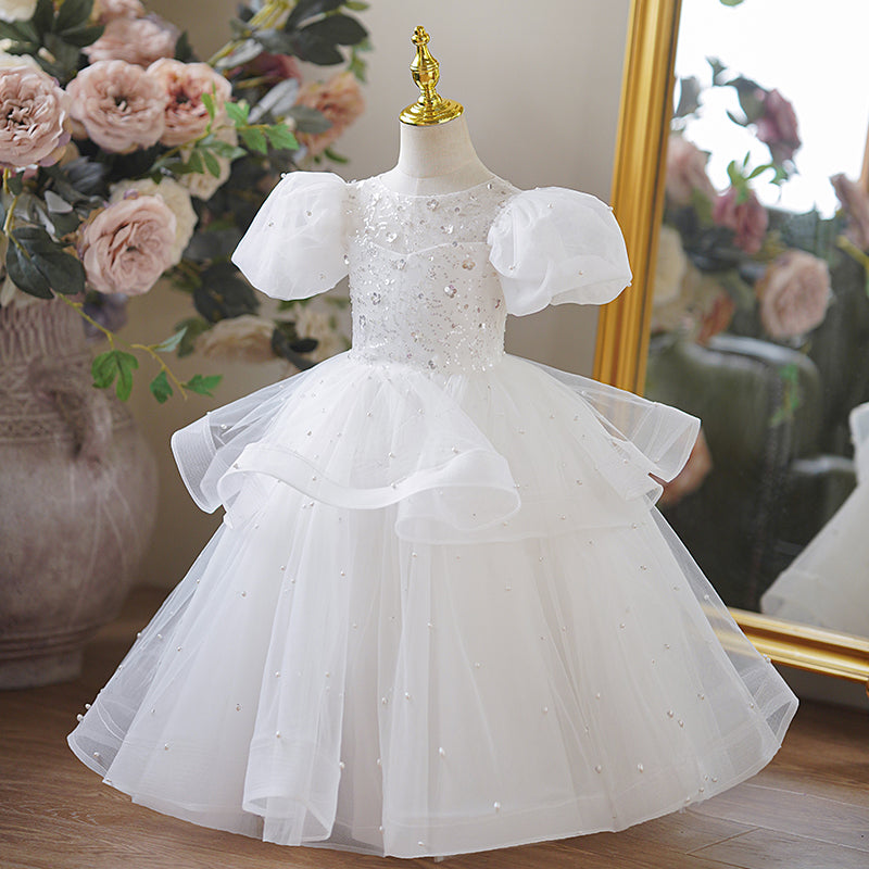 Beading Jewel Ruffle White Flower Girl Dress with Short Sleeves