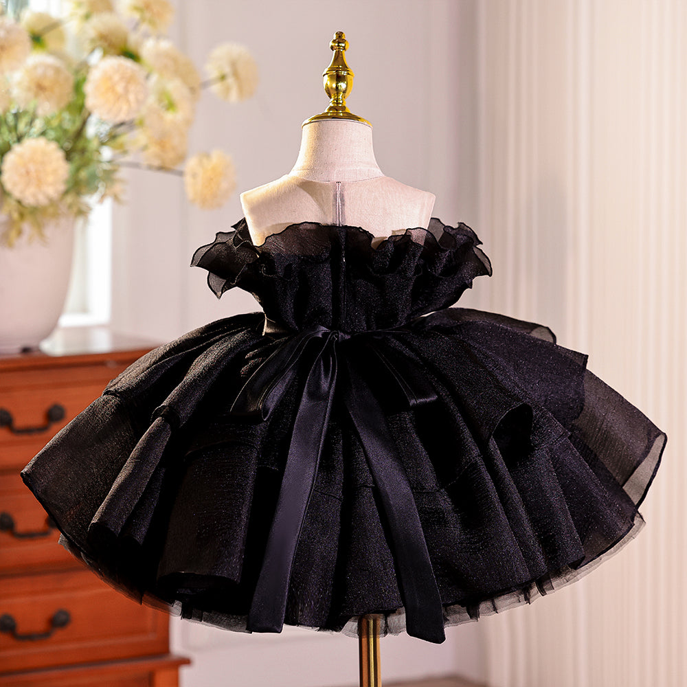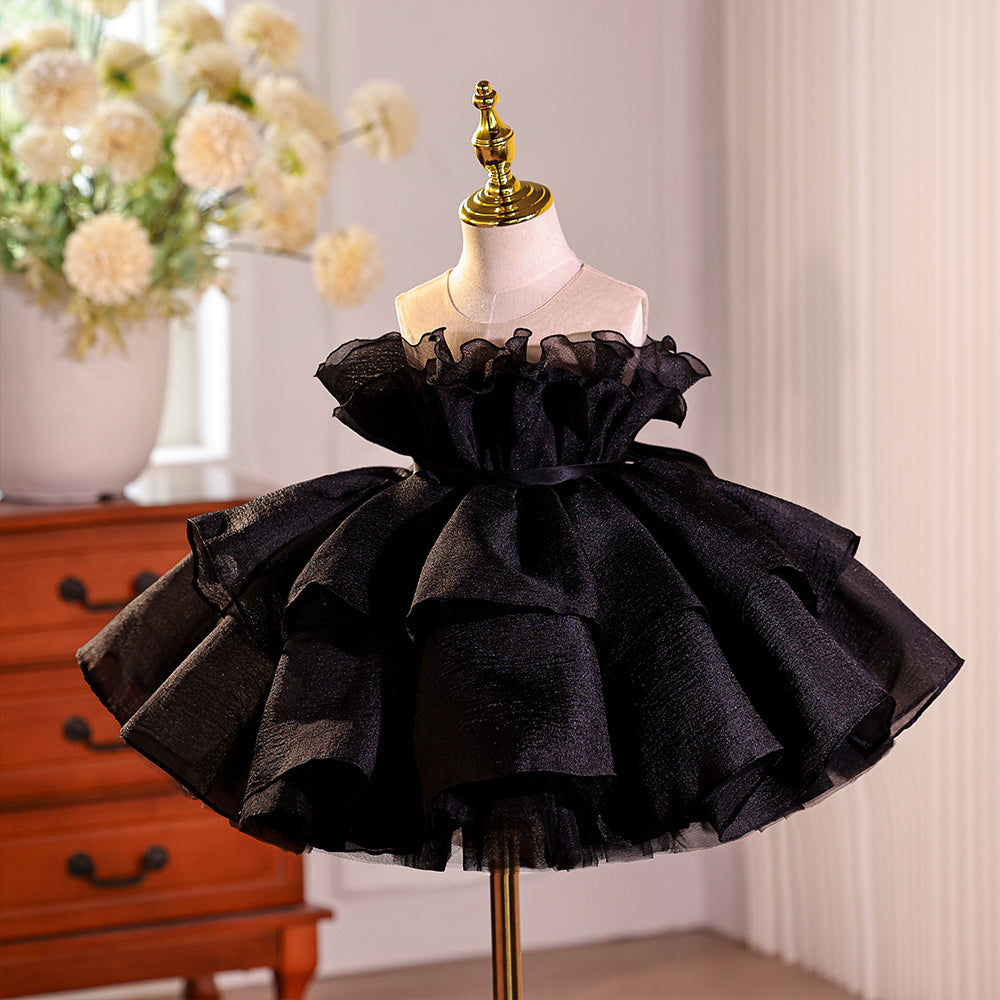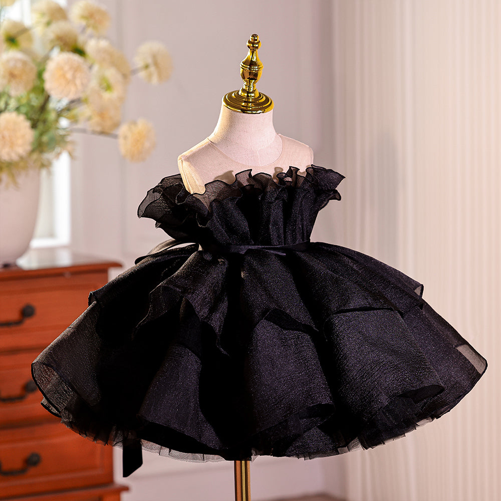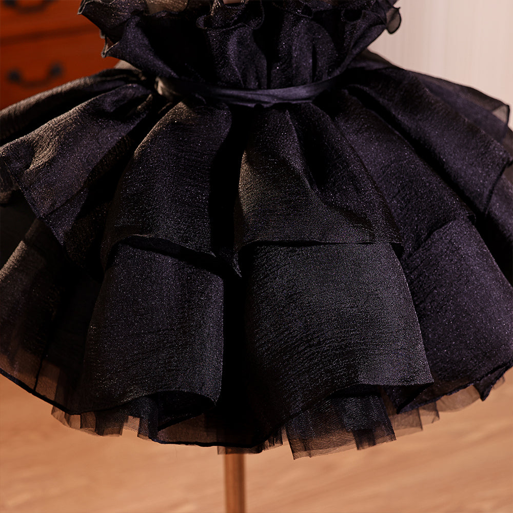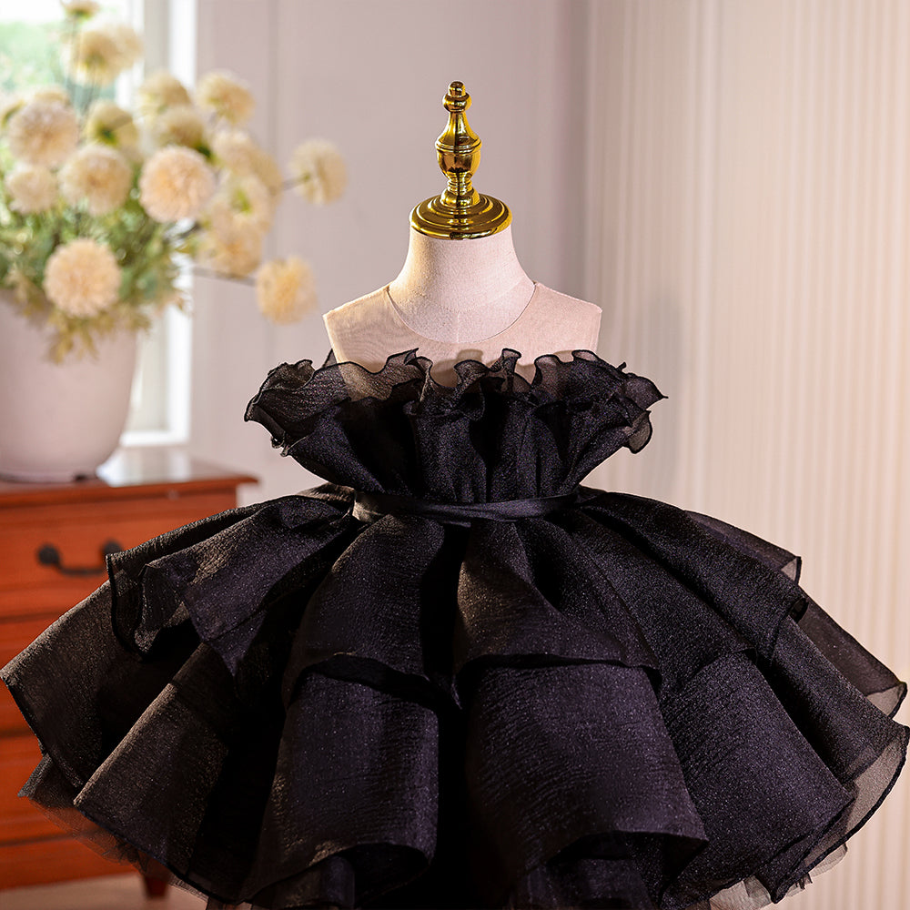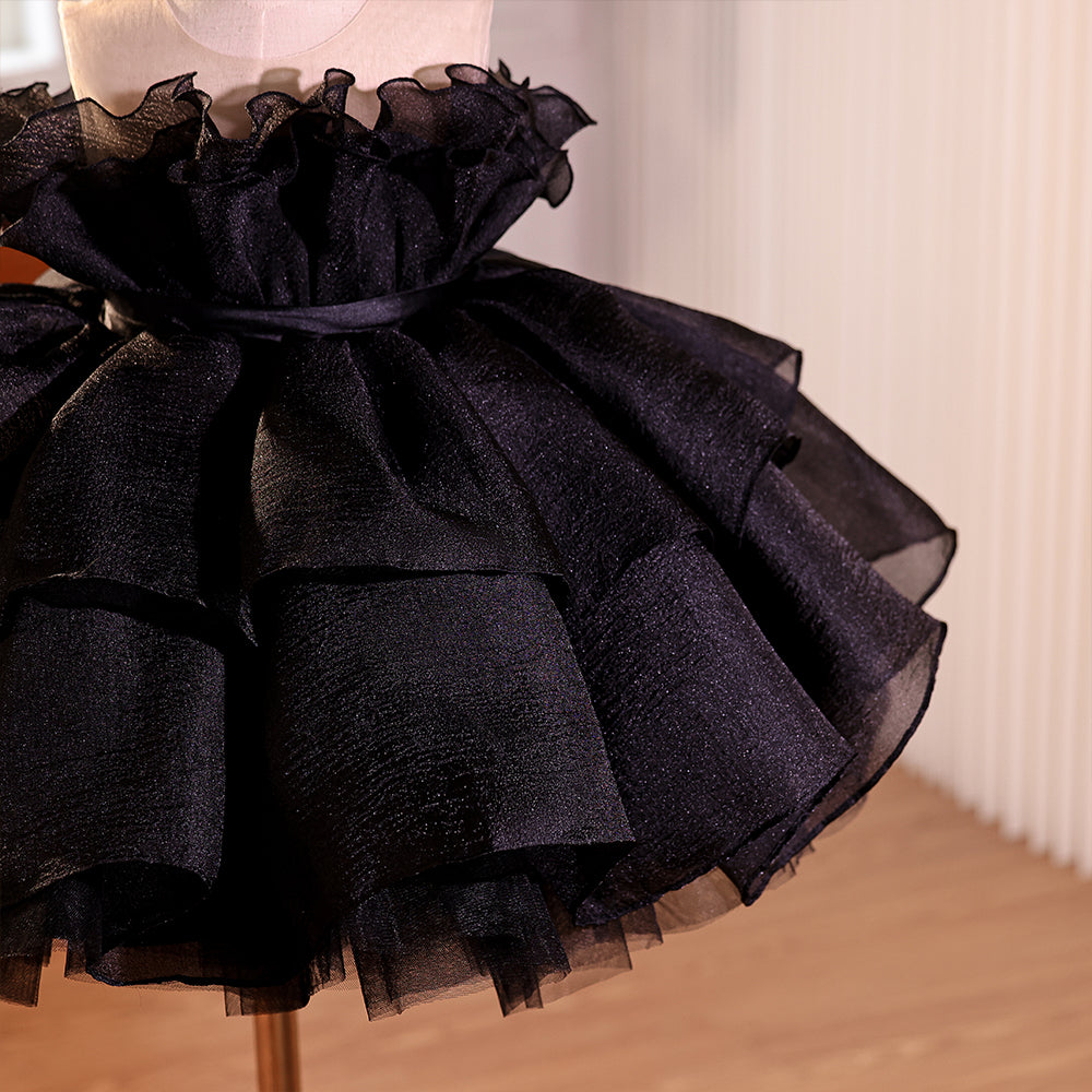 Black Ruched Sheer Neckline Tulle Girls Pageant Dress