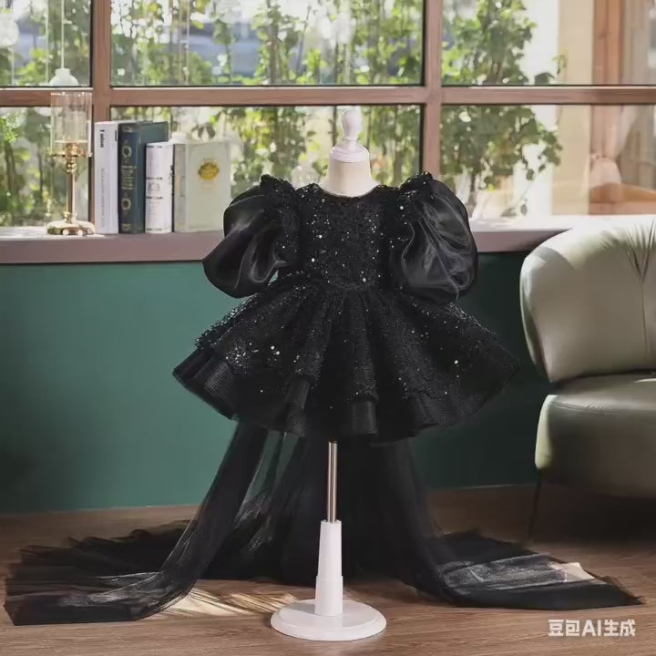 Black Sequin Girls Pageant Dress with Puff Sleeves & Detachable Train