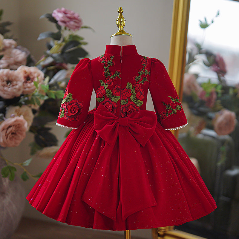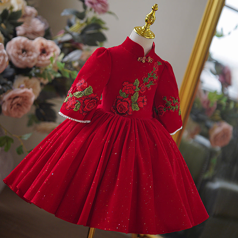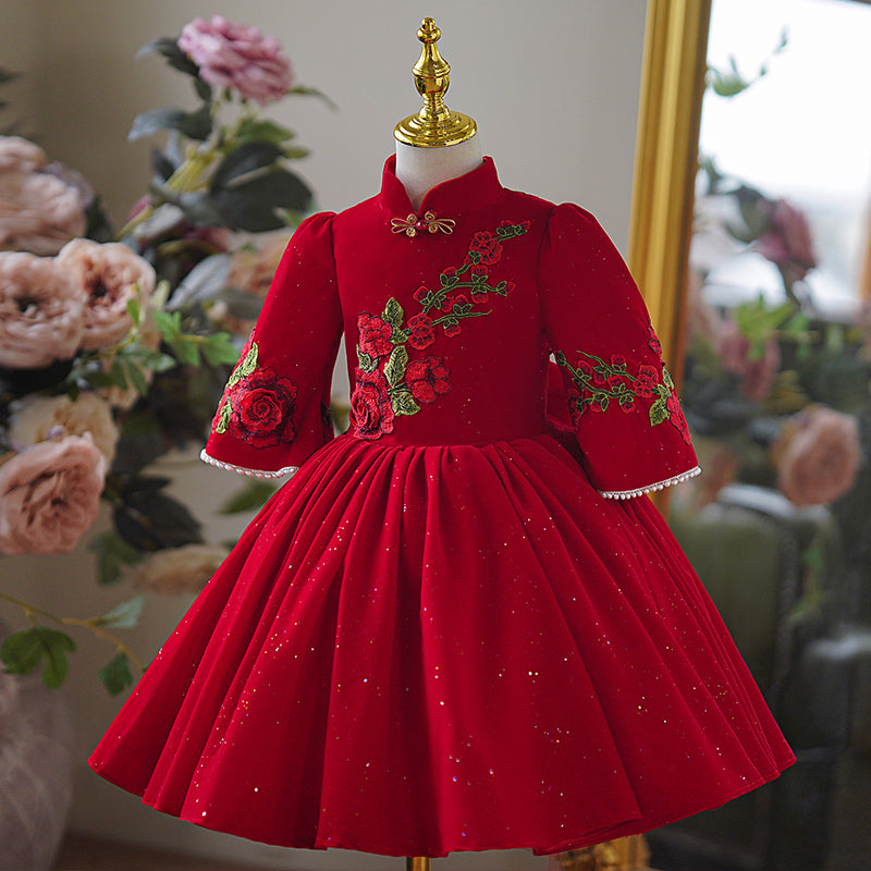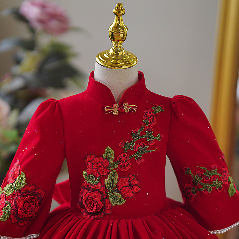 Chinese Style High Neckline Lace Applique Girls Pageant Dress with Half Length Sleeves