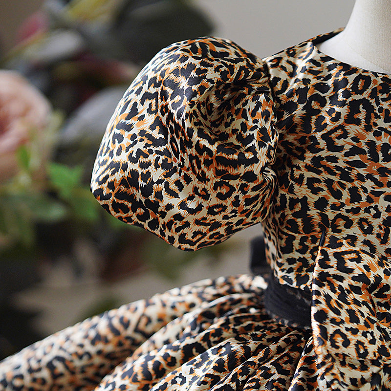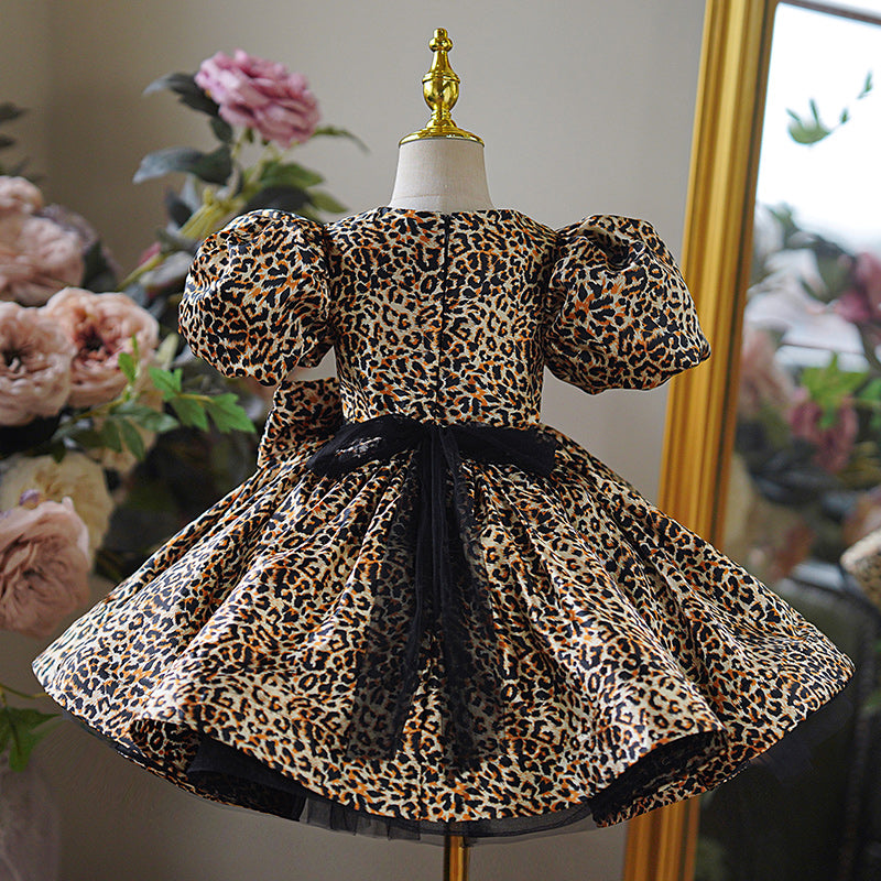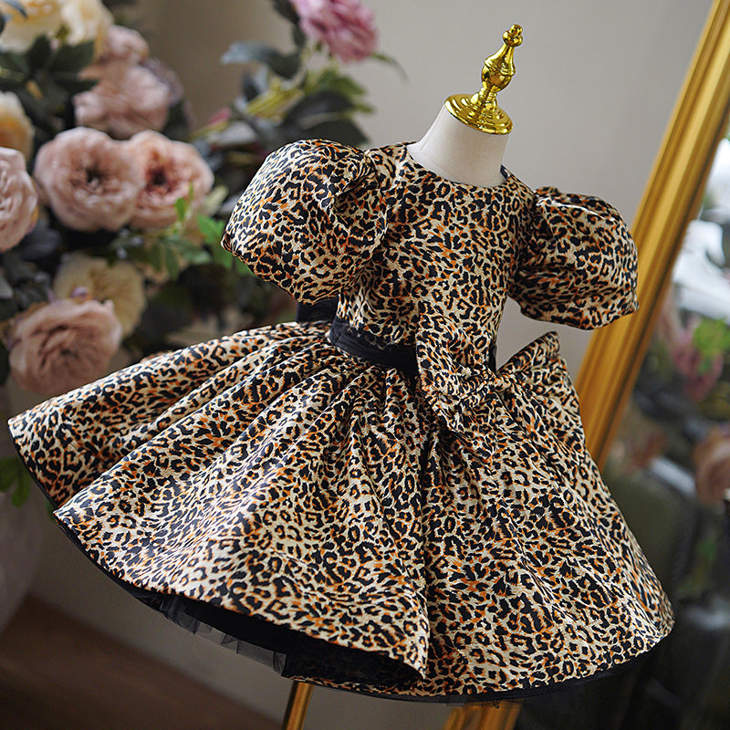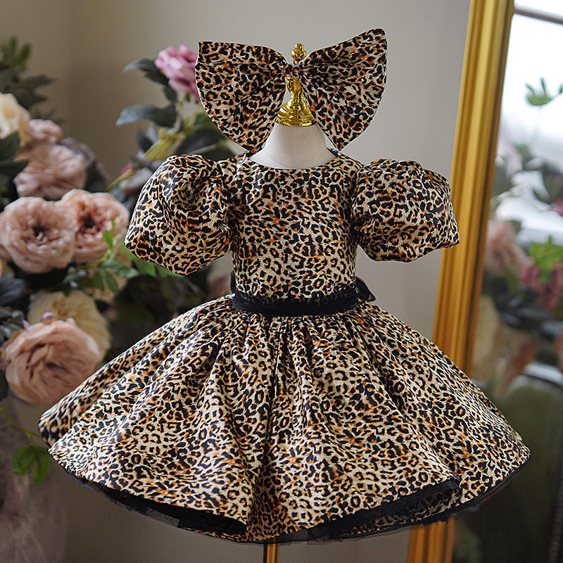 Leopard Print A-line Girls Pageant Dress with Puff Sleeves