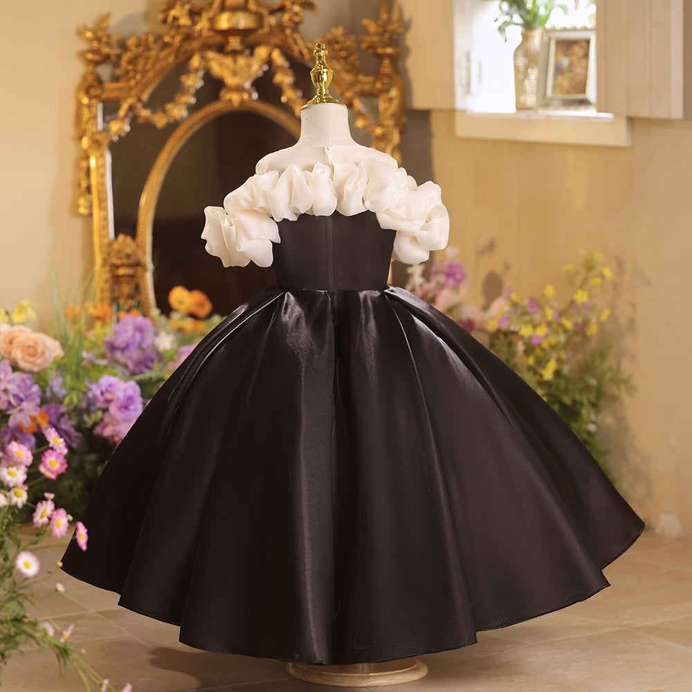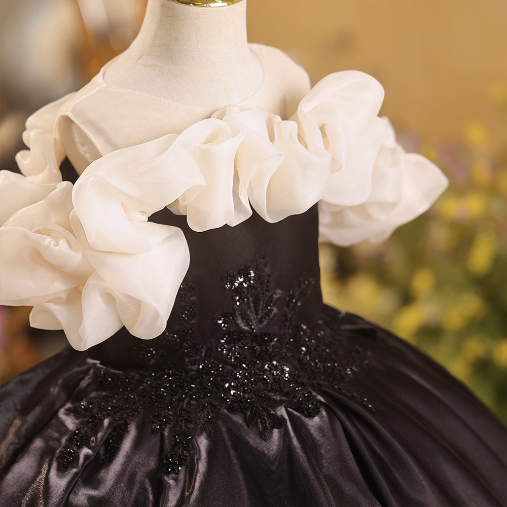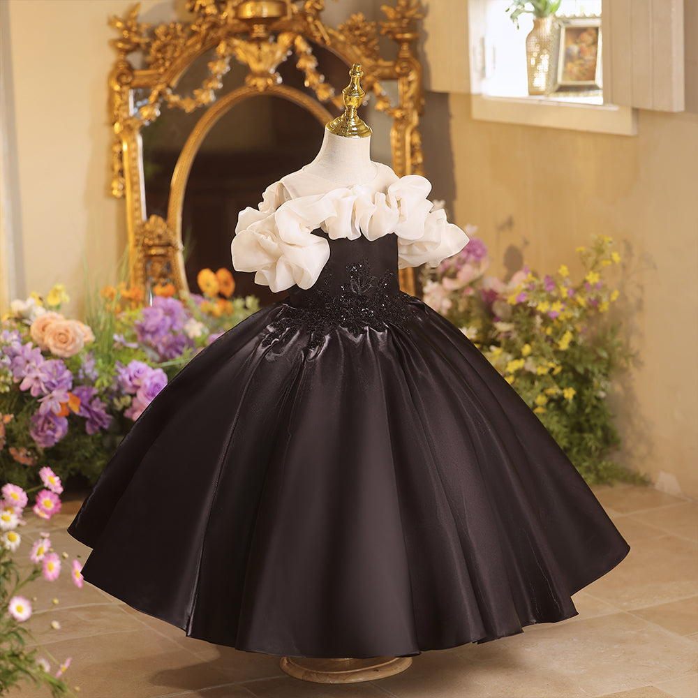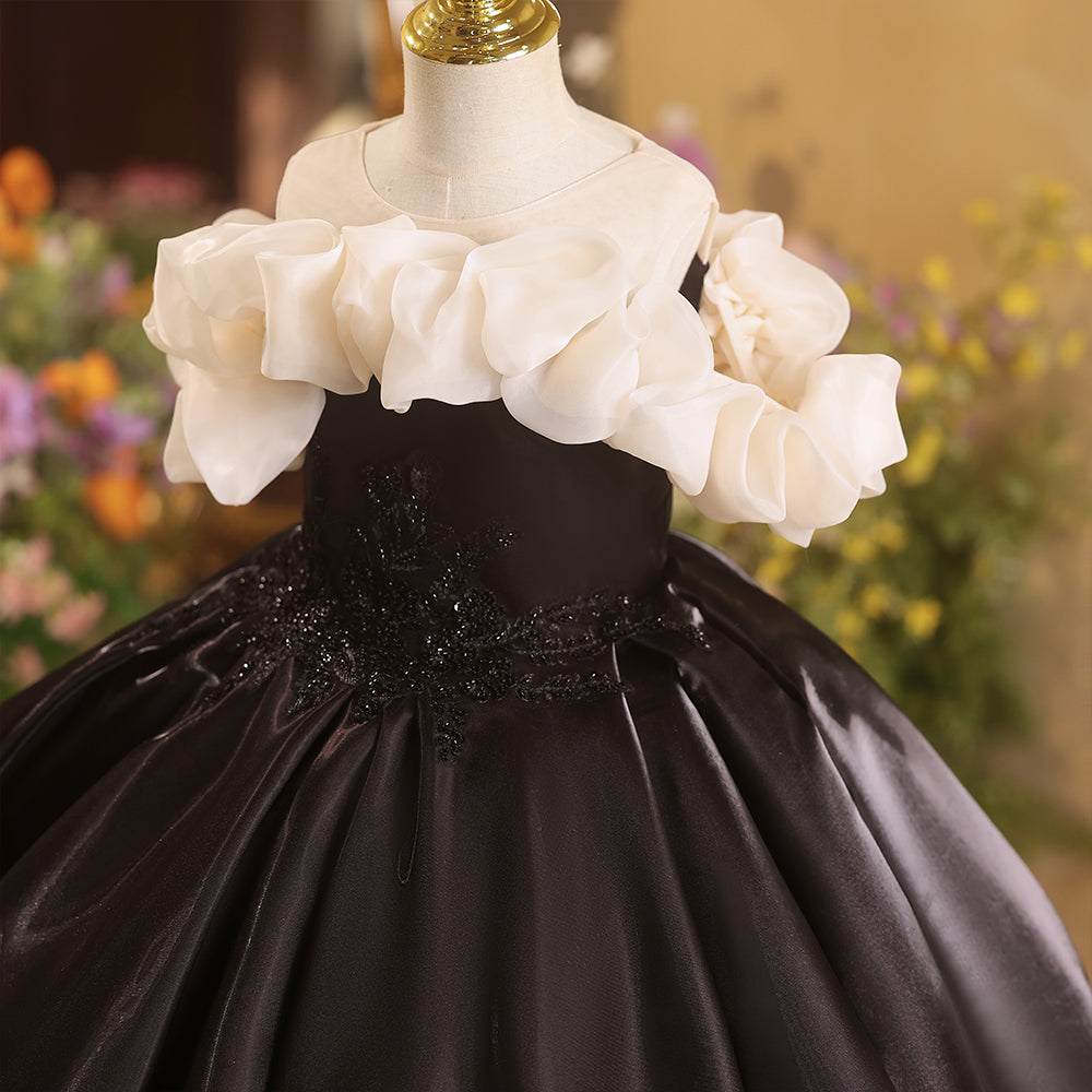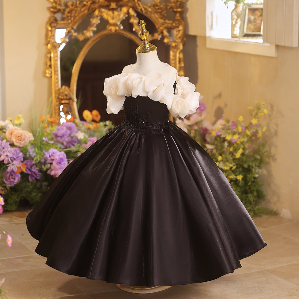 Off Shoulder Black Beaded Applique Satin Junior Bridesmaid Dress