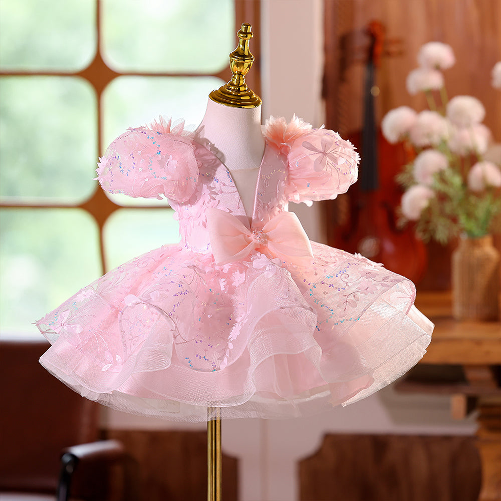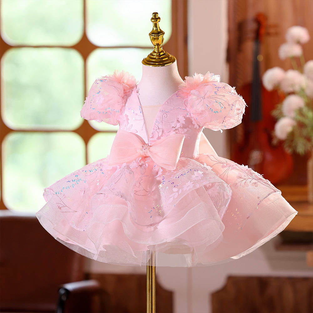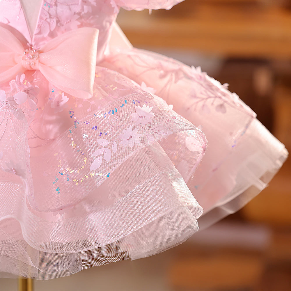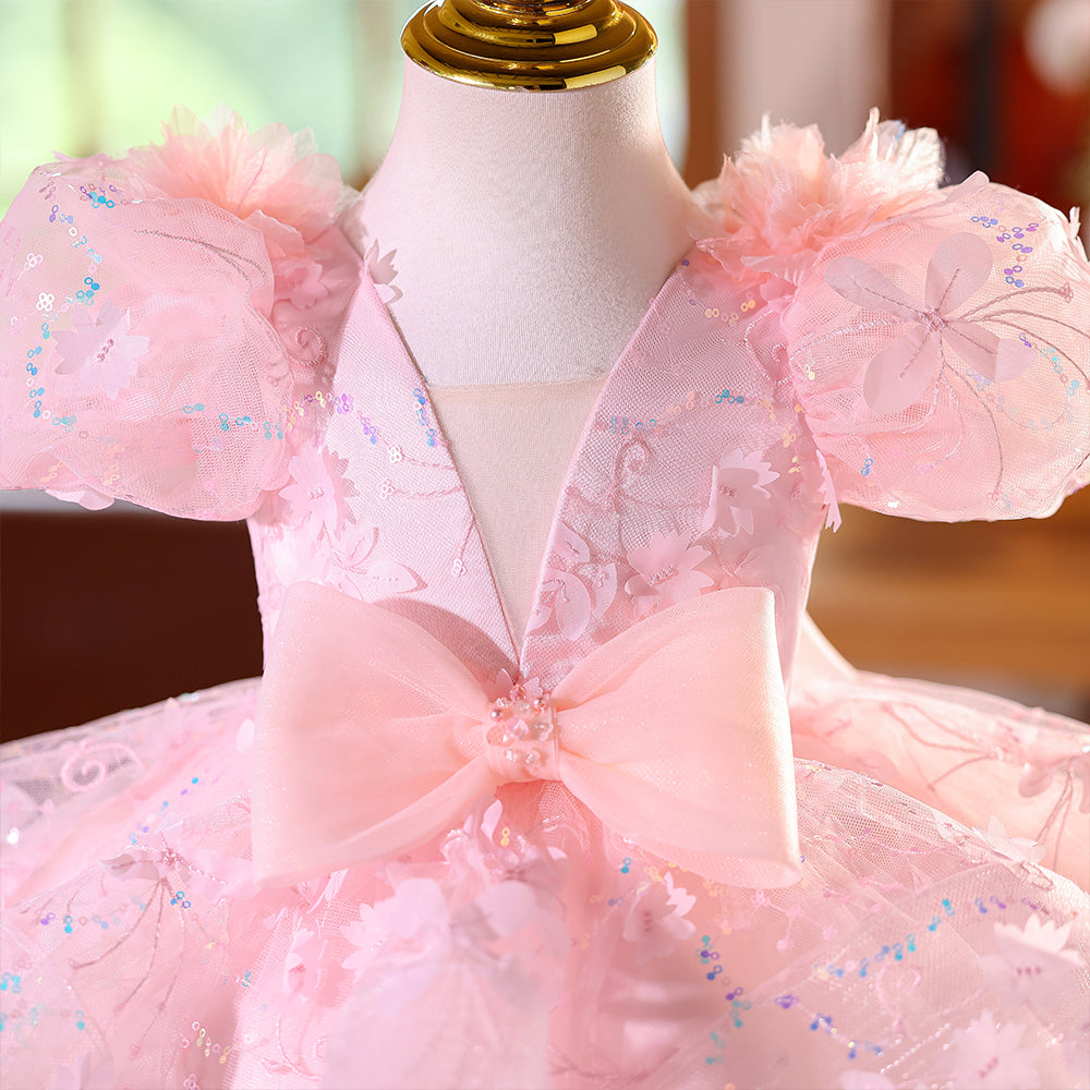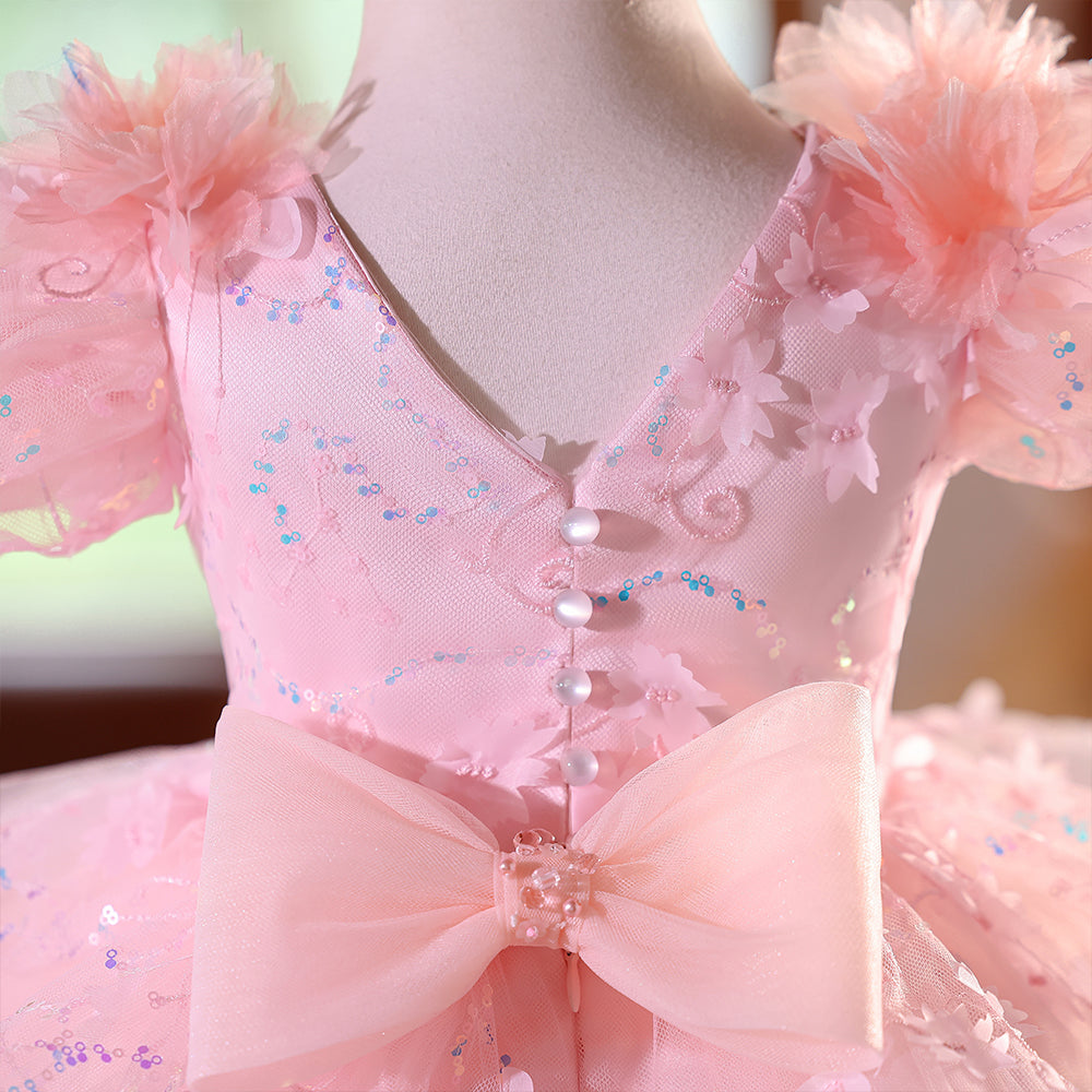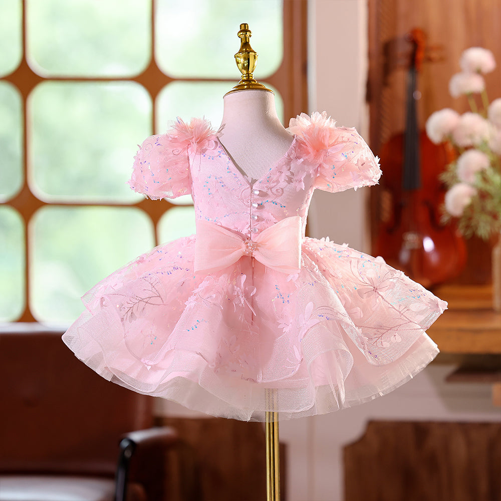 Pink V-neck Beading Girls Pageant Dress with Short Sleeves & Bowknot