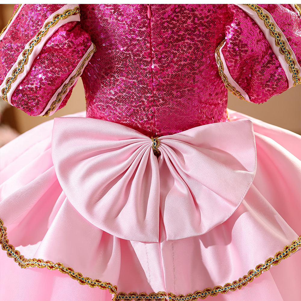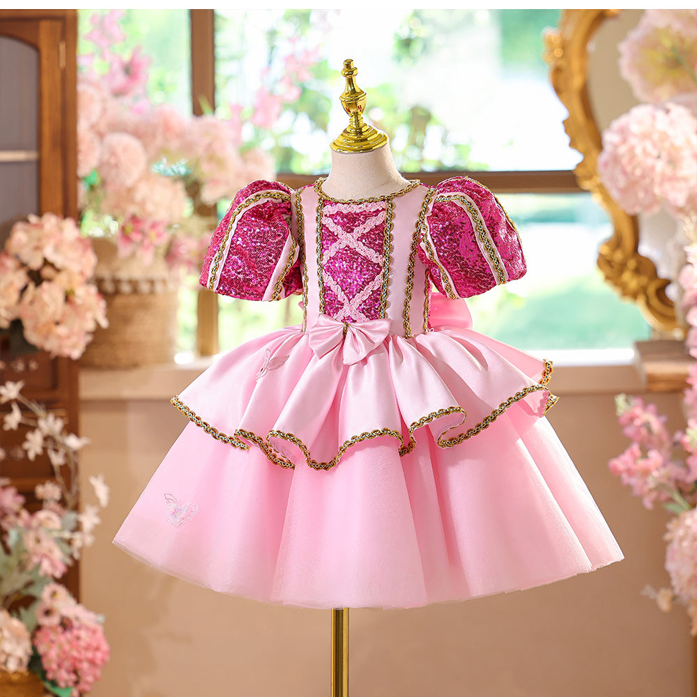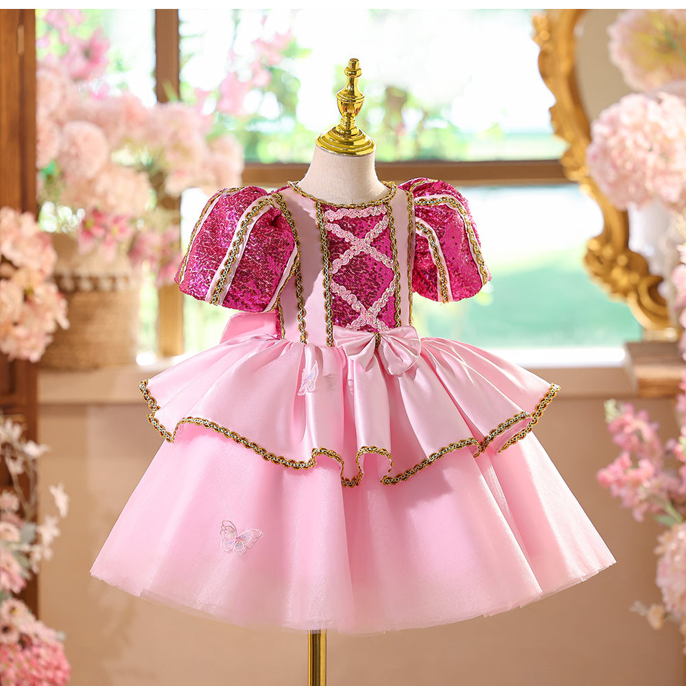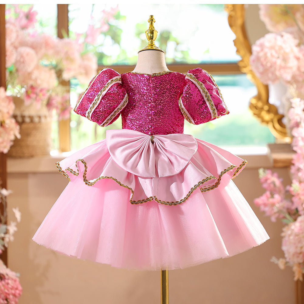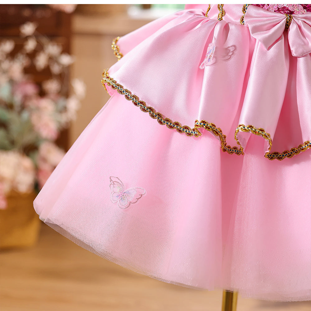 Sequin Pink Jewel Layered Skirt Girls Pageant Dress with Short Sleeves & Bowknot