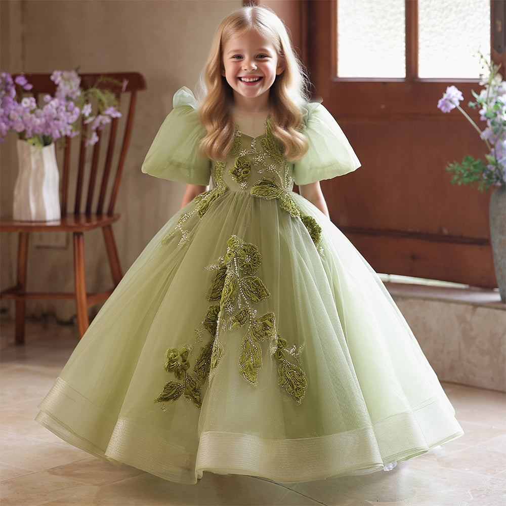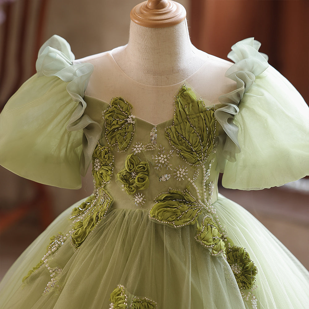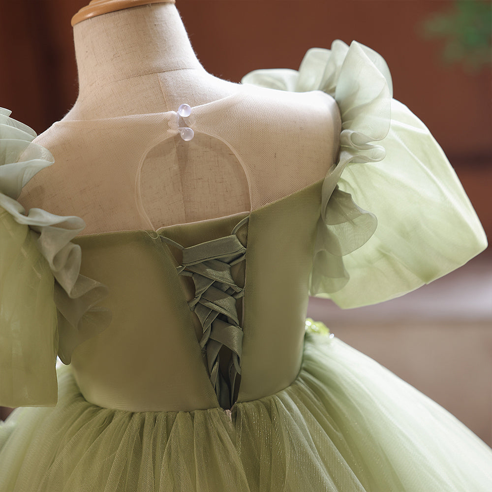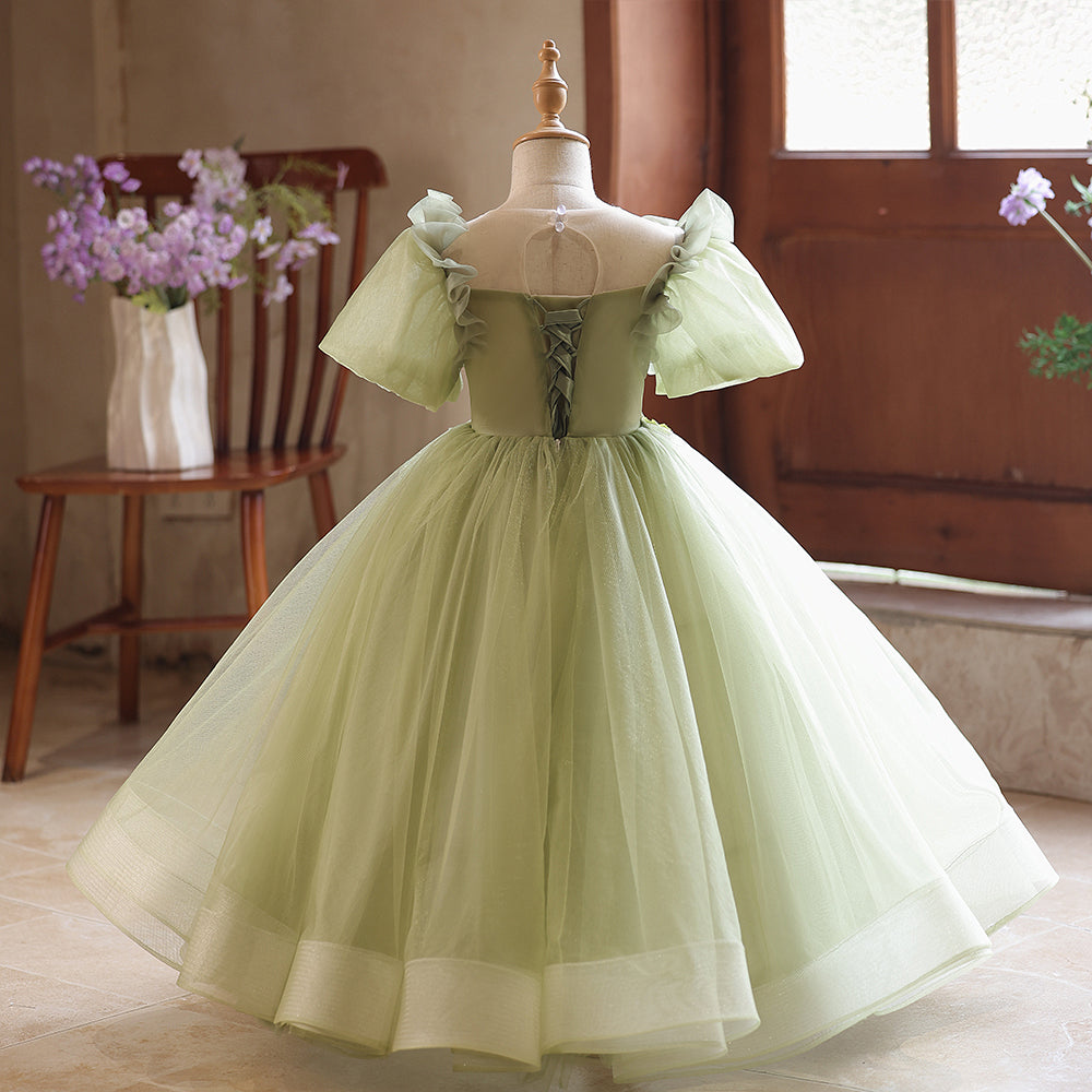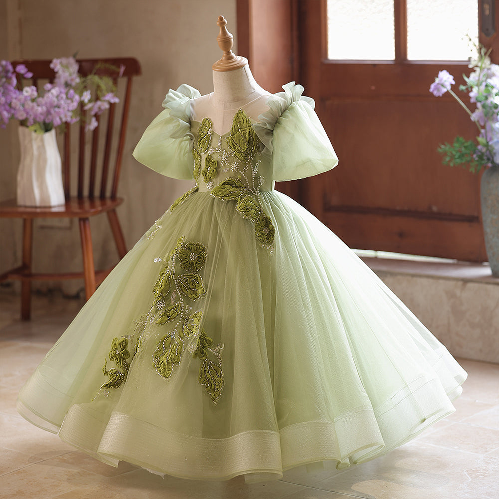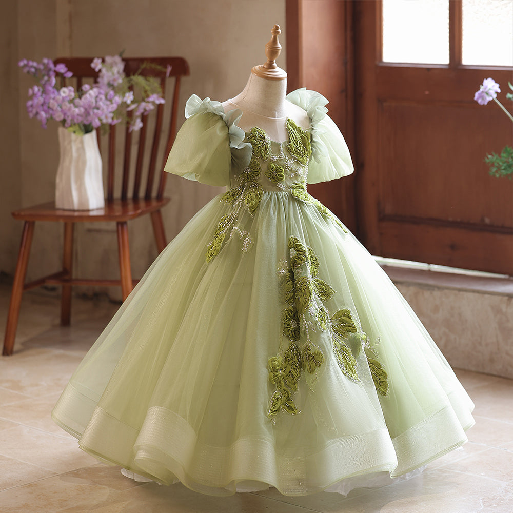 Sheer Neckline Mint Lace Applique Girls Pageant Dress with Short Sleeves