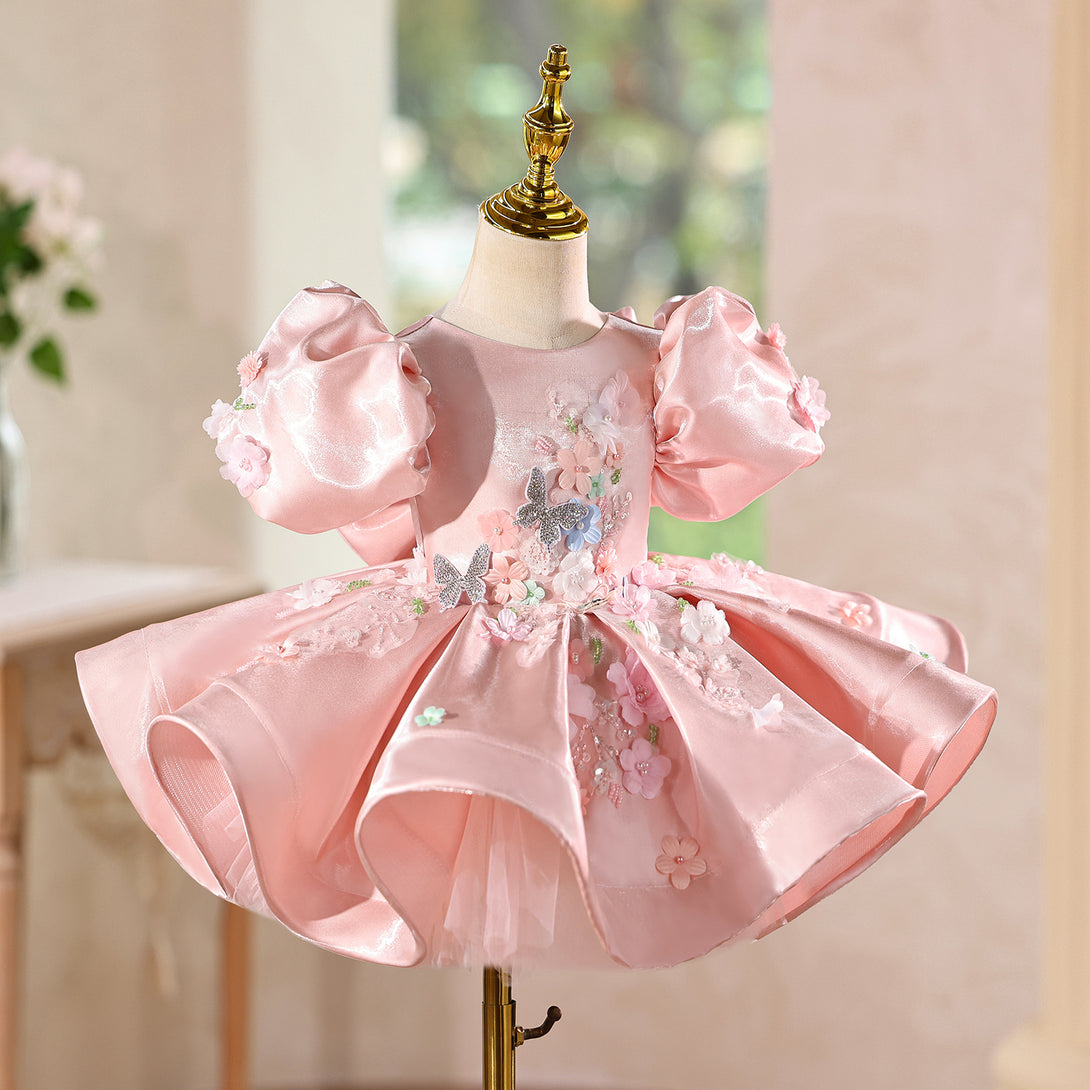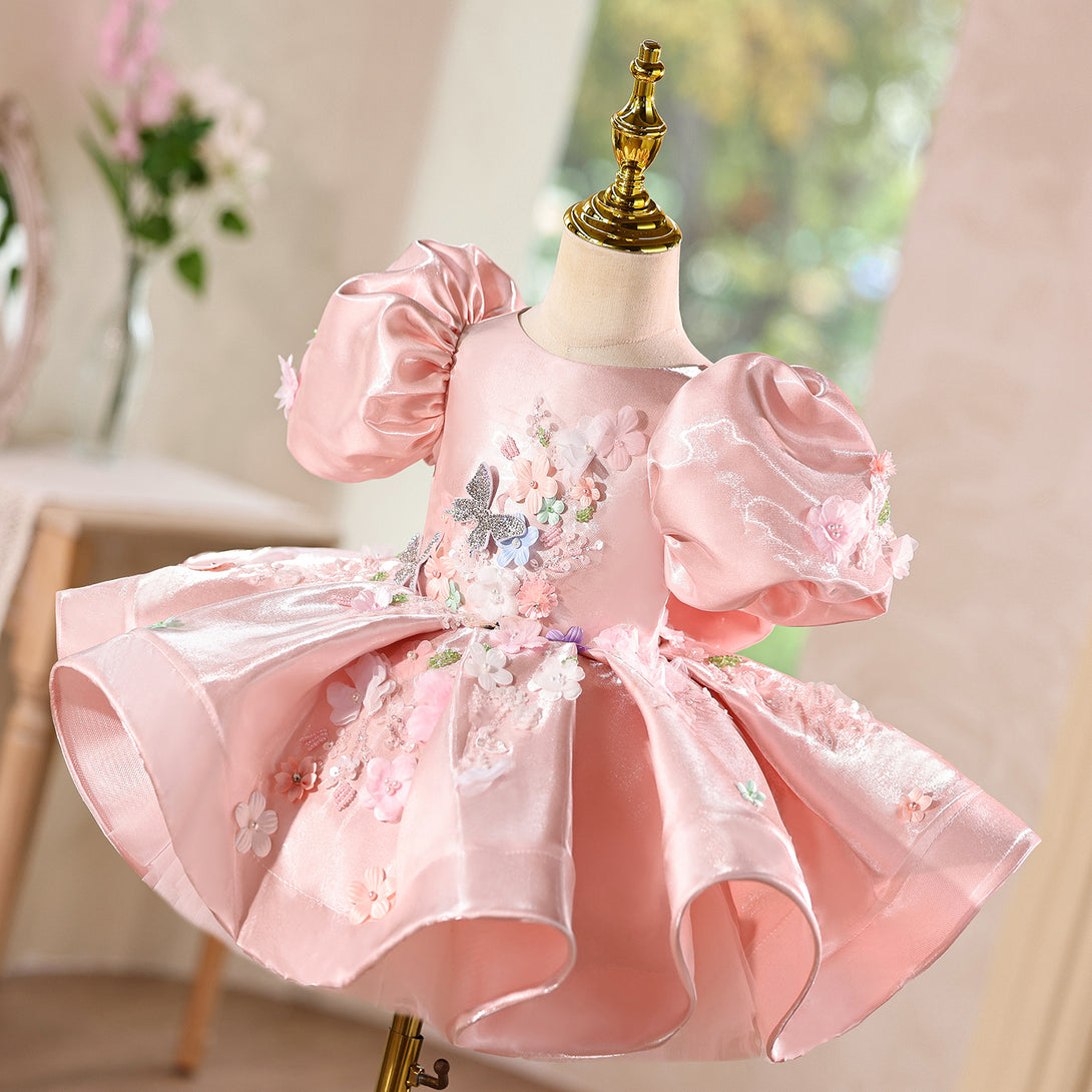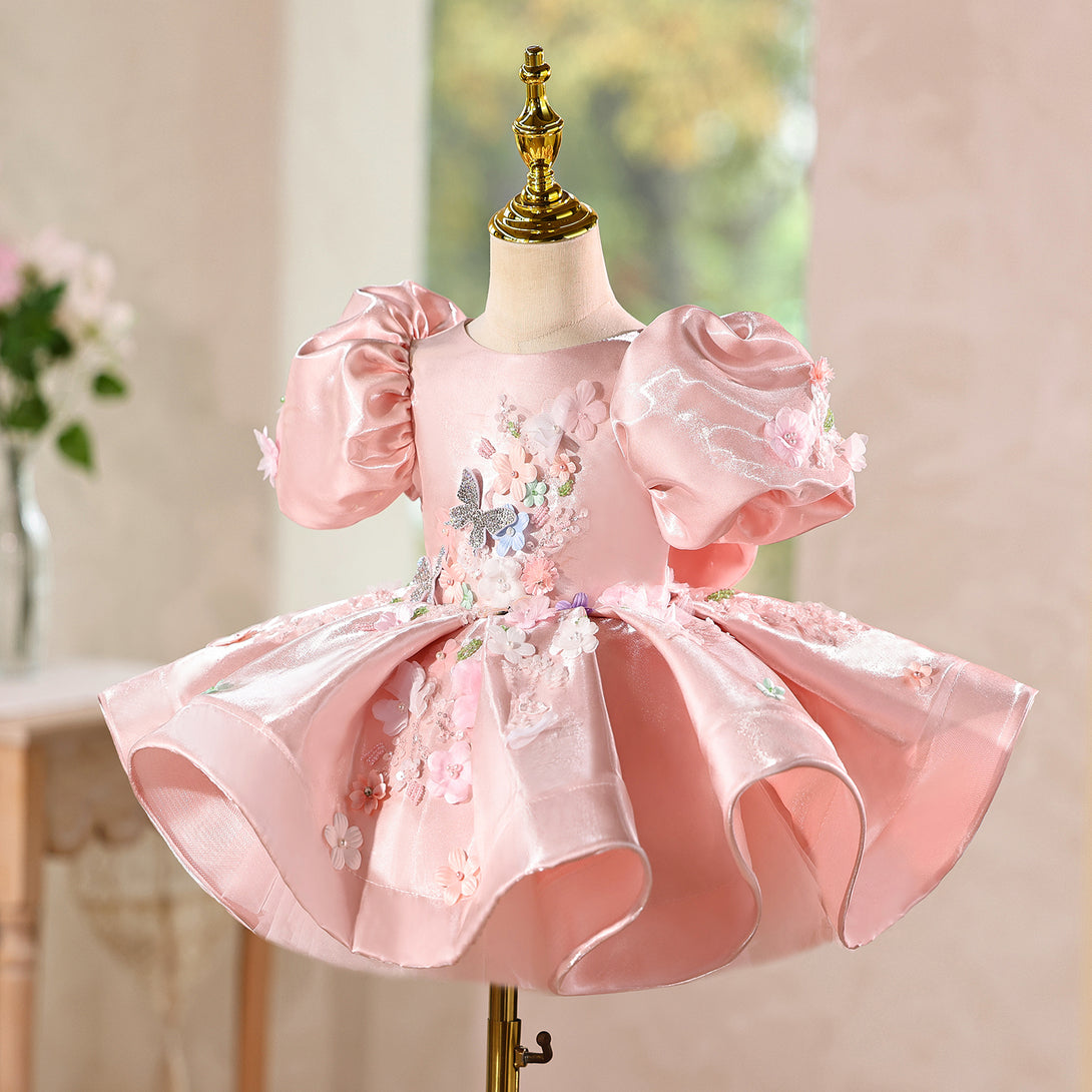 Shimmering Satin & 3D Flowers Girls Pageant Dress with Beaded Embroidery