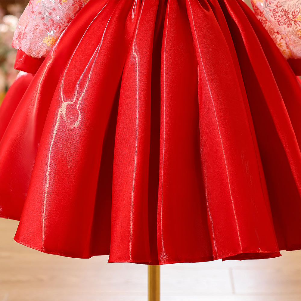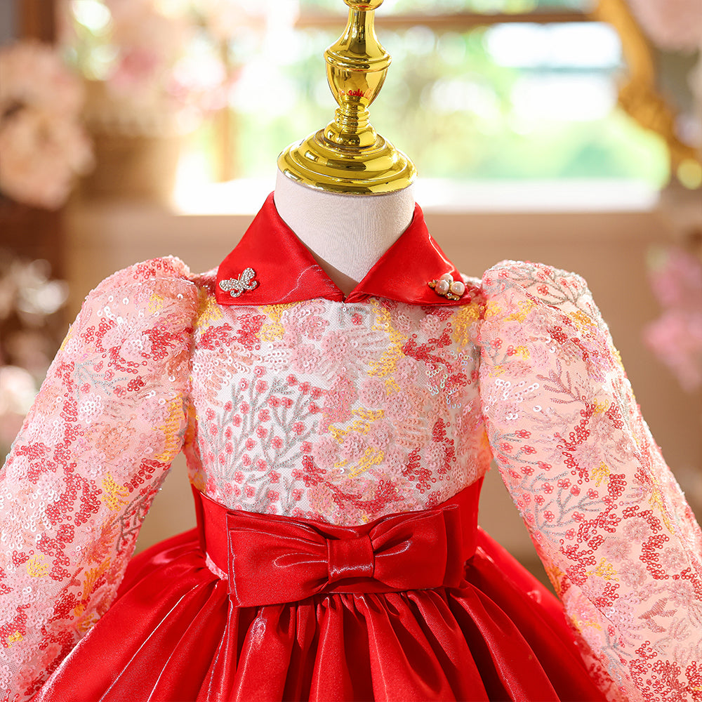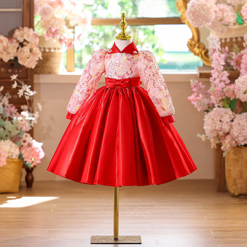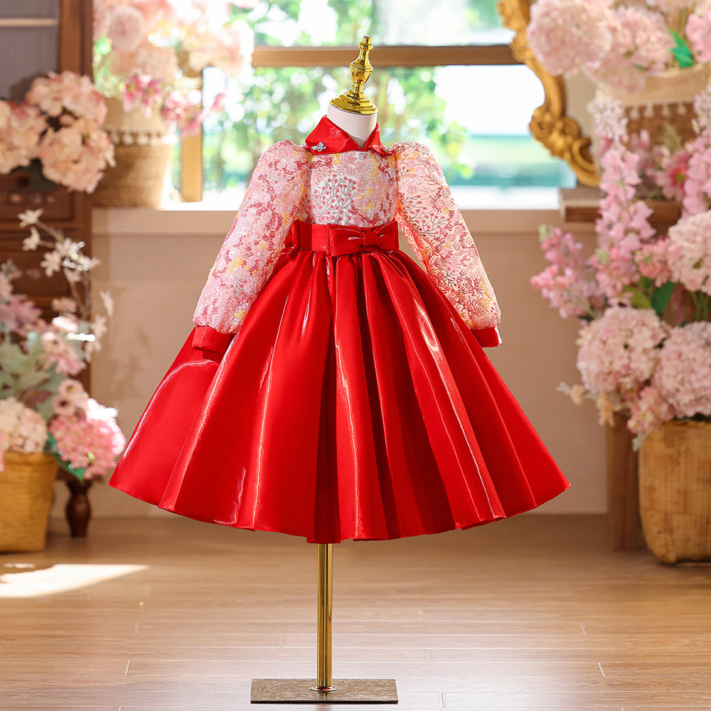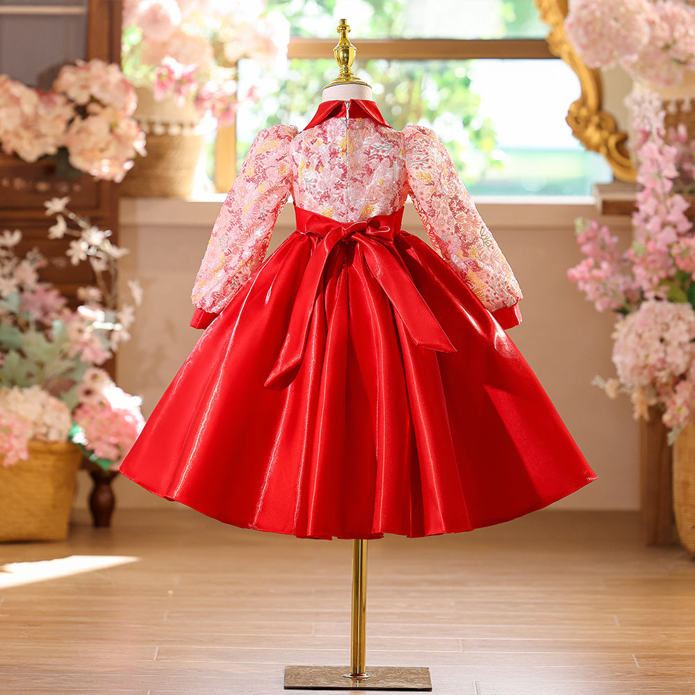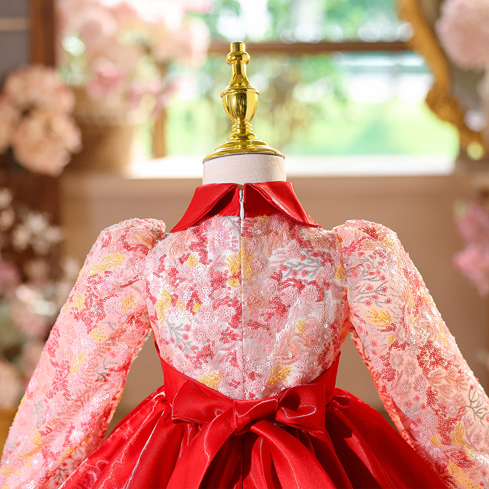 Special Lace Bodice High Neck Red Girls Pageant Dress with Long Sleeves