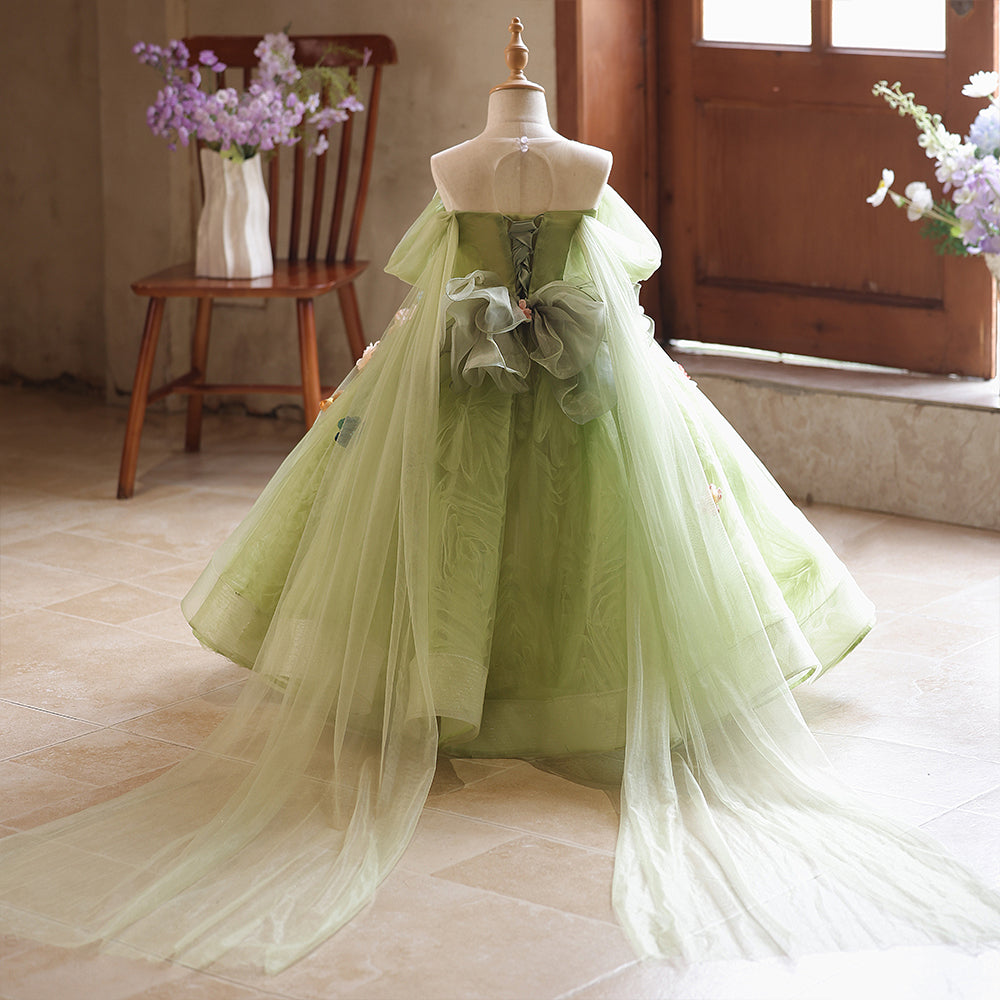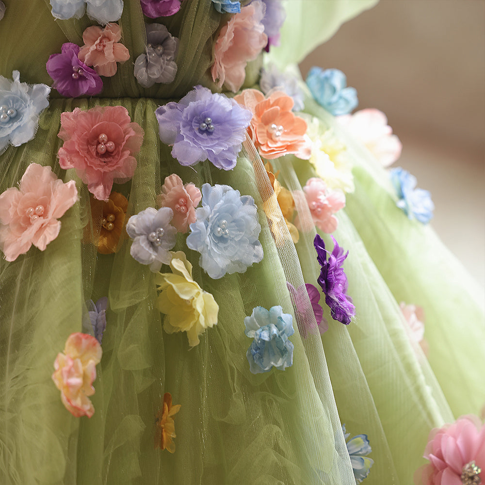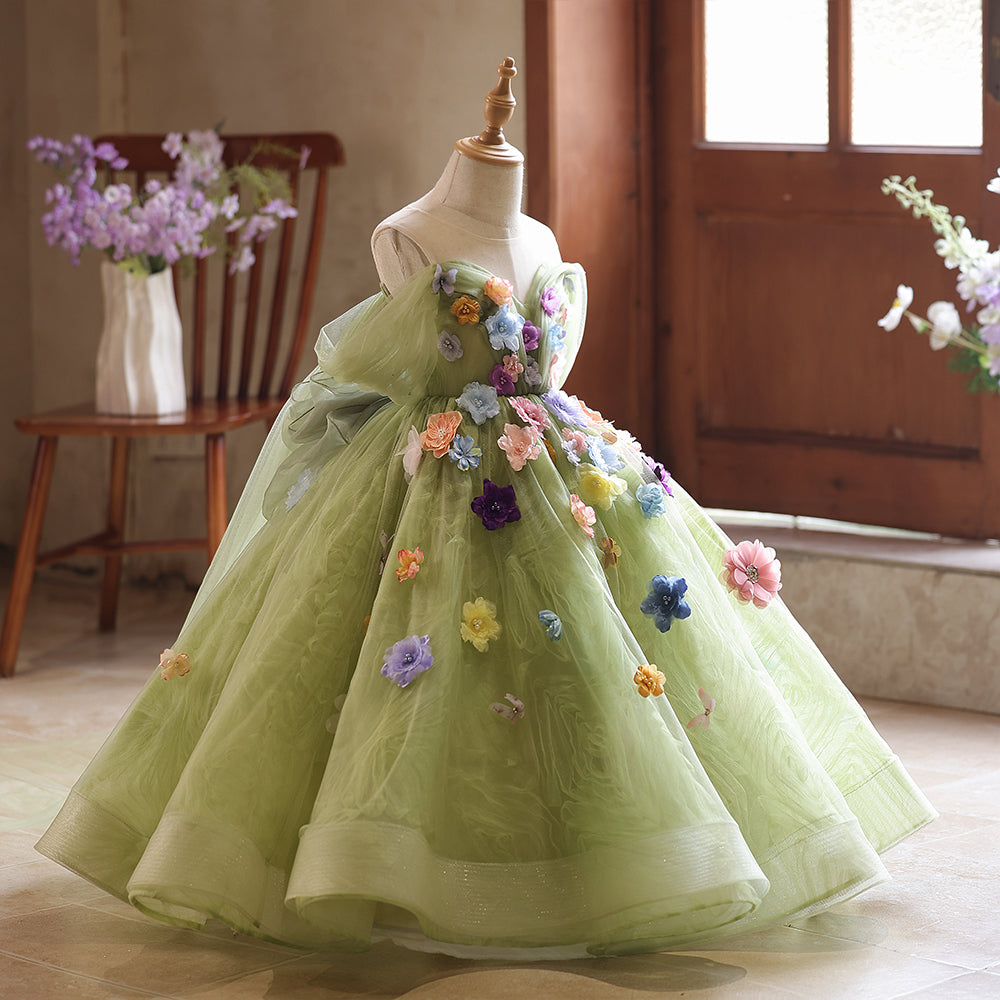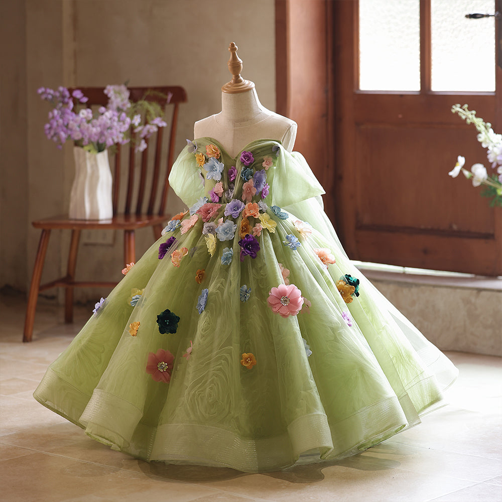 Tulle 3D Flowers Floral Off the Shoulder A-line Girls Pageant Dress