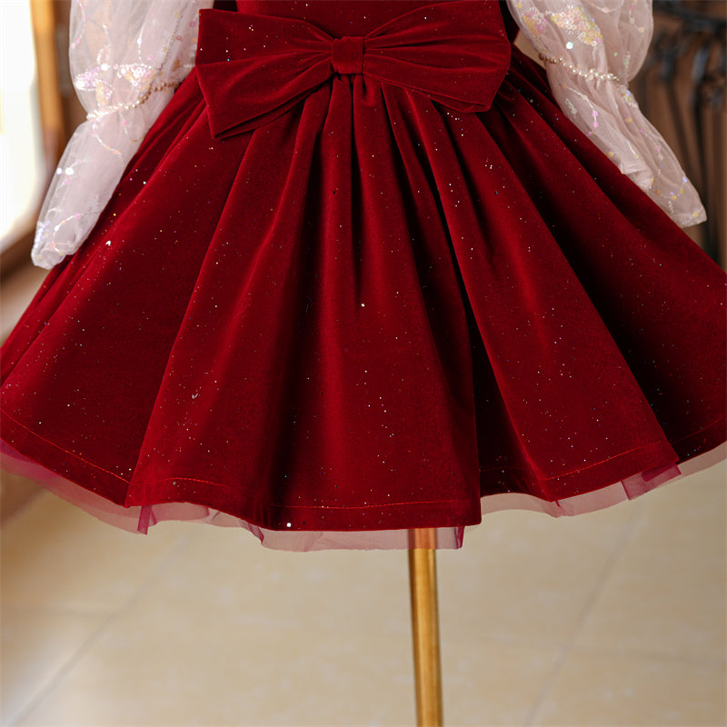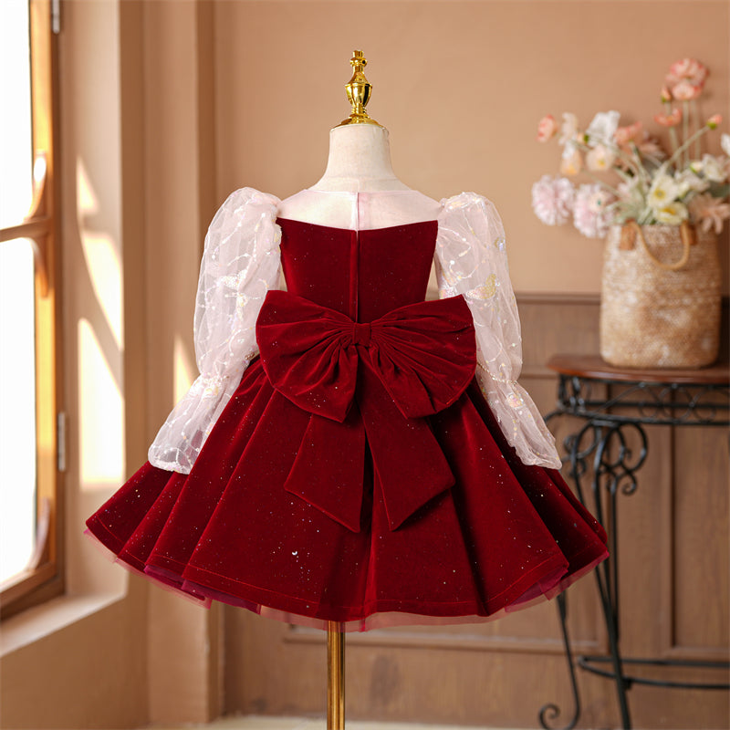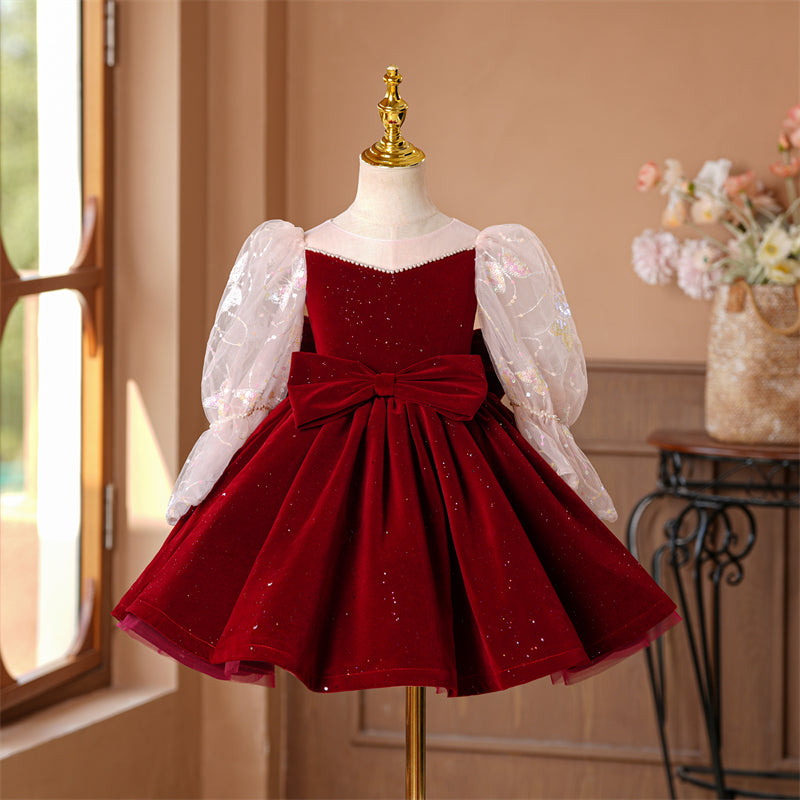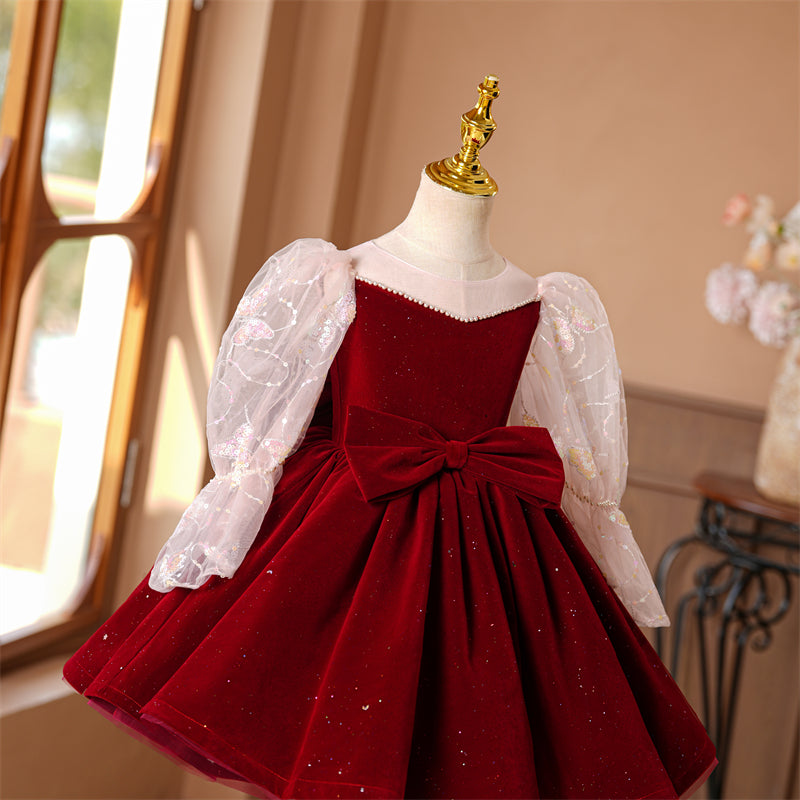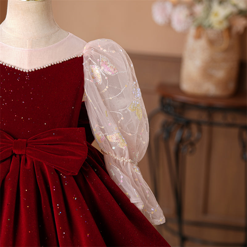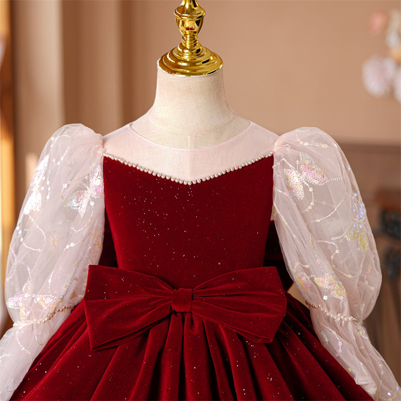 Velvet Burgundy Girls Pageant Dress with Long Sleeves