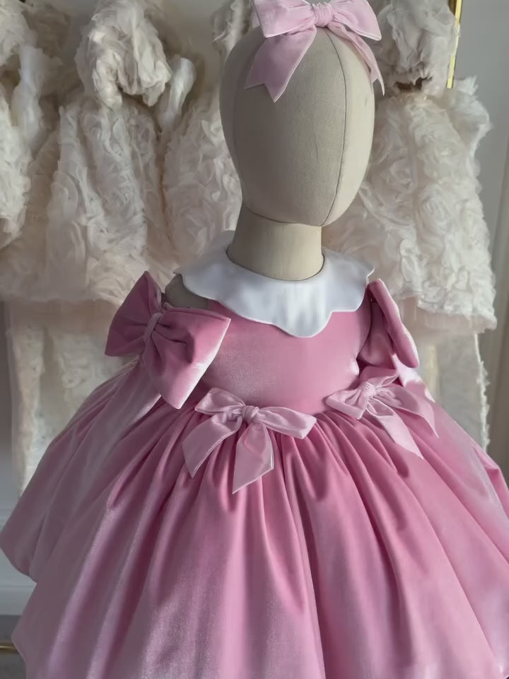 Velvet Pink Girls New Year Birthday Dress with Detachable Long Sleeves